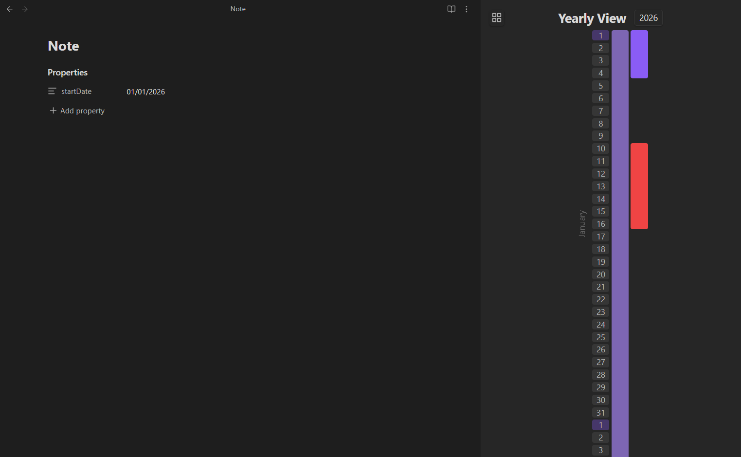 startDate: (Required) The start date of the event or note.endDate: (Optional) The end date.- If provided: The note is marked as Done (100% saturation).
