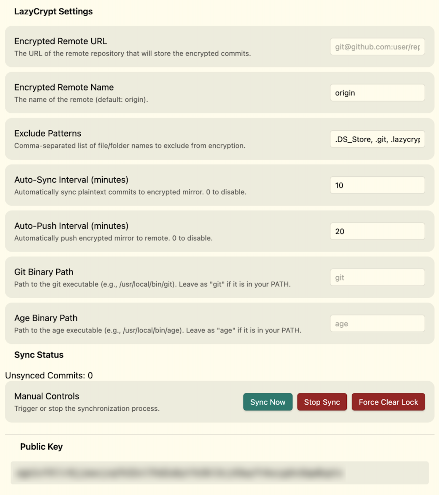 .lazycrypt/directory, generates an age key pair, and sets up the encrypted bare repository. - Configure remote: Open Settings -> LazyCrypt and set the Encrypted remote URL to your target git remote (e.g.,