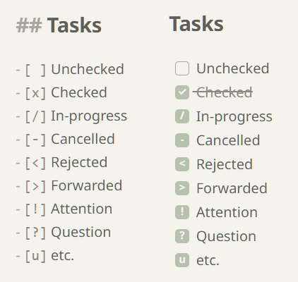 [/],[>],[!],[-], etc.) into a fully rendered, visual icon. This extends Obsidian's default behavior to support any custom workflow you can imagine. - 🎨 Broad theme compatibility — Built-in support for the custom styles of popular community themes. It applies surgical CSS fixes to ensure every marker aligns perfectly with your chosen aesthetic, regardless of which theme you prefer.