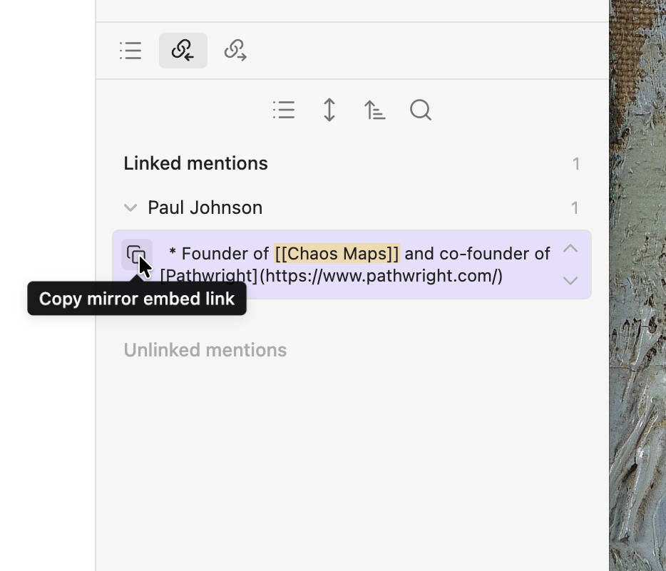 Mirror adds a copy button to linked mentions in the backlinks sidebar. When you click it, the plugin finds the matching mention block, creates a block reference ID if one does not exist yet, and copies the embed-ready reference so you can paste it directly into another note.