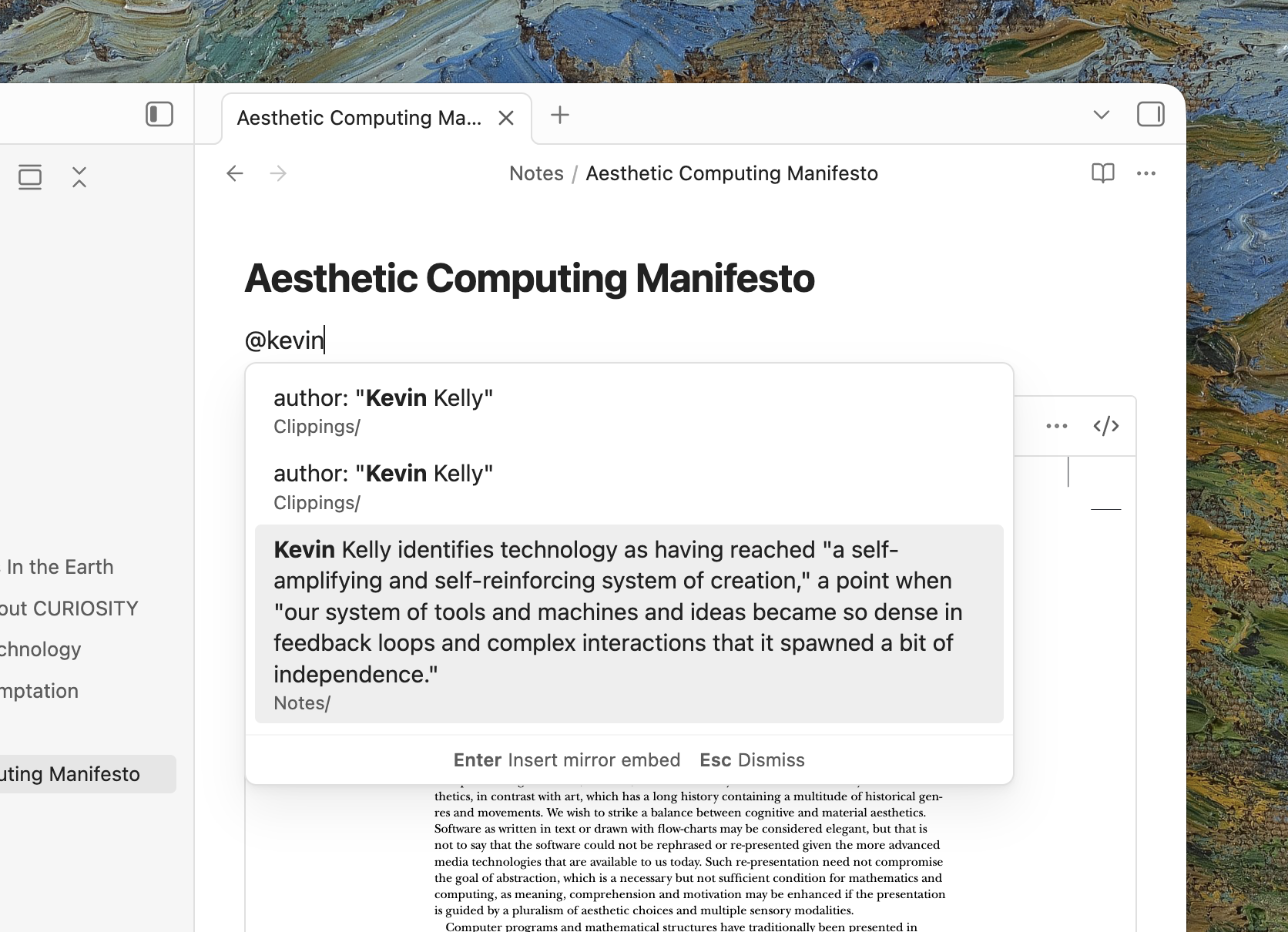 Mirror includes an @mention search flow that can find matching text across your Obsidian vault and turn it into a block reference right from the editor. Start a line with @, search for the text you want, then select a result to generate a block ID when needed and insert the reference into your document automatically.