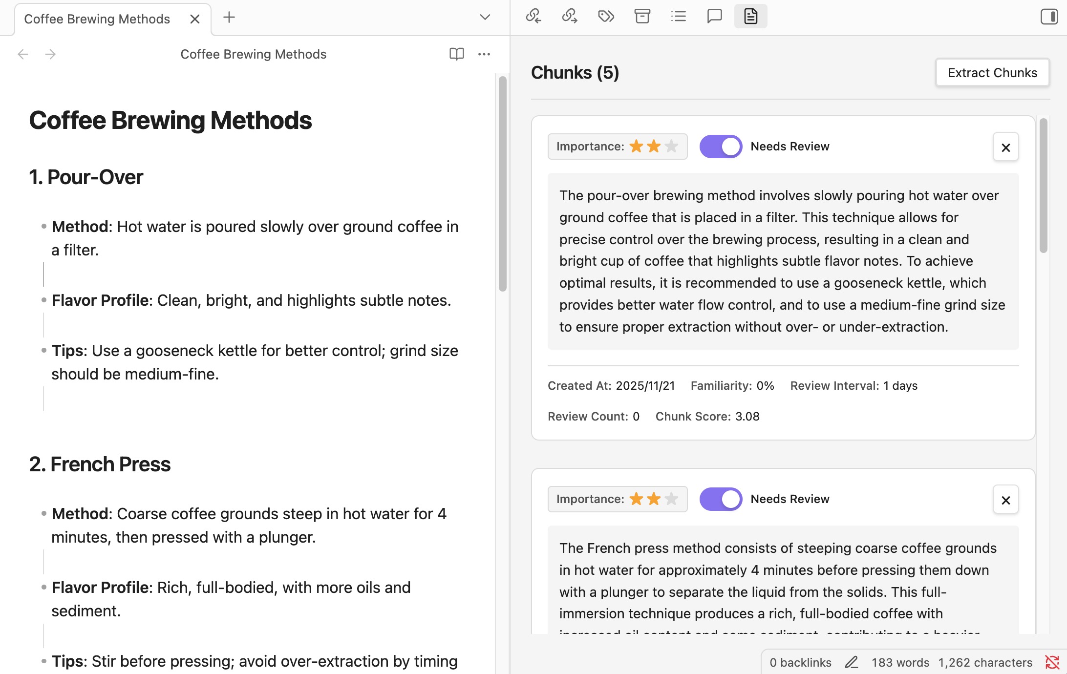 - Set Importance: Mark important chunks with higher importance for more frequent review