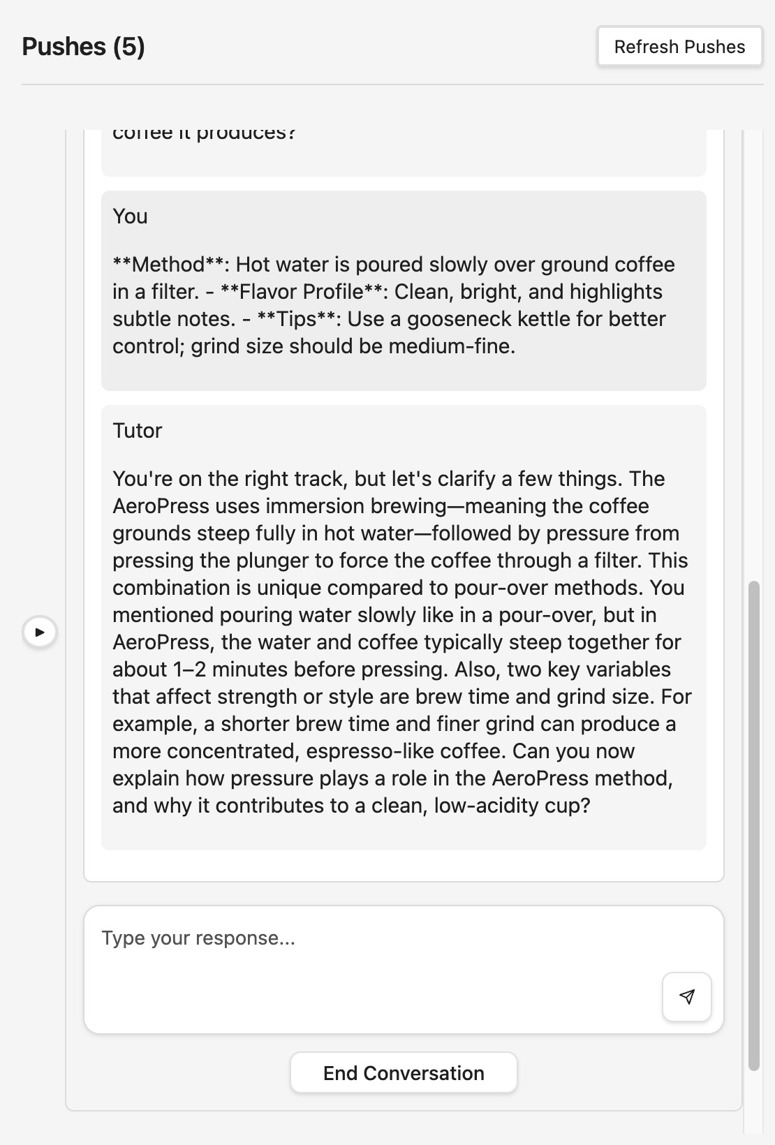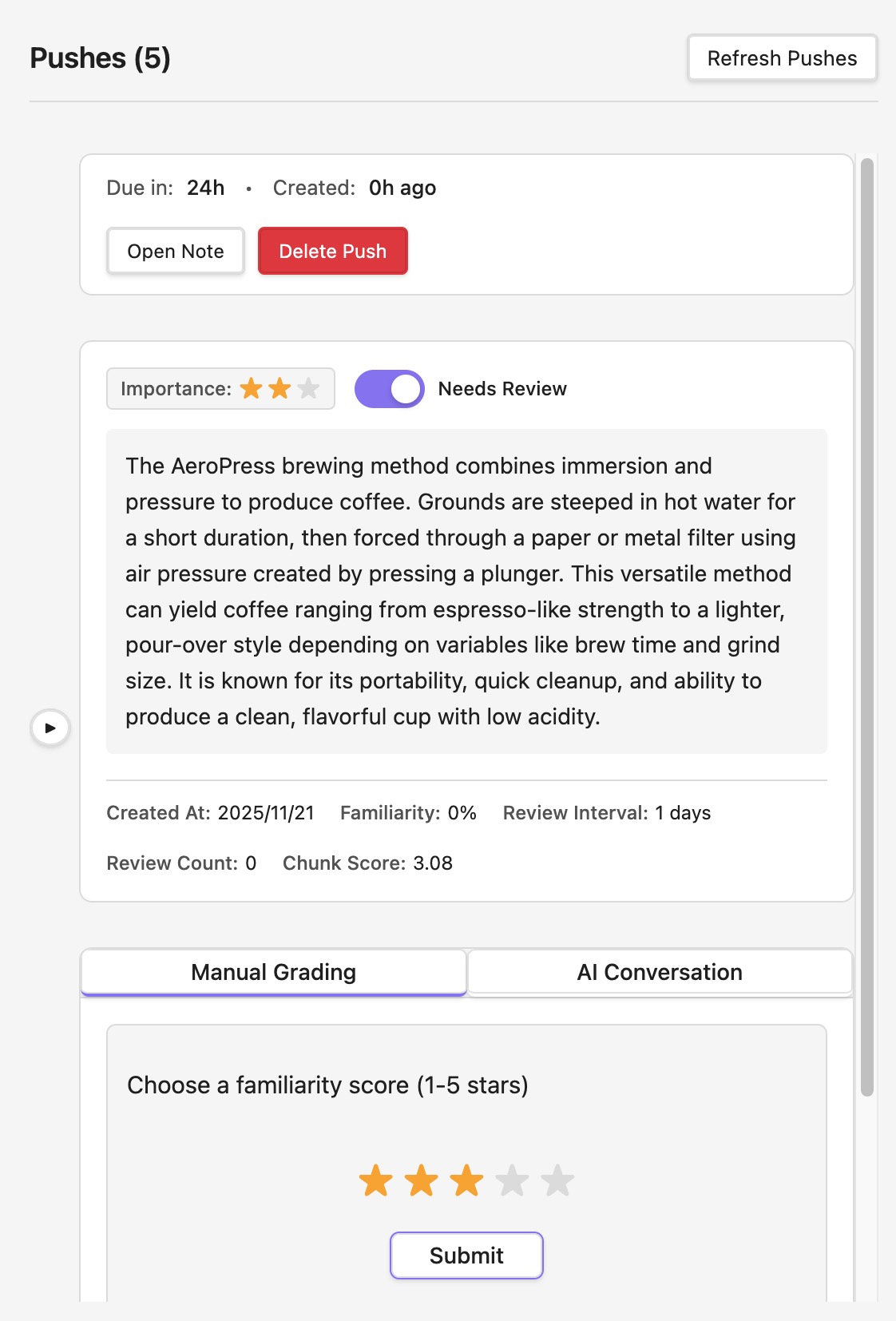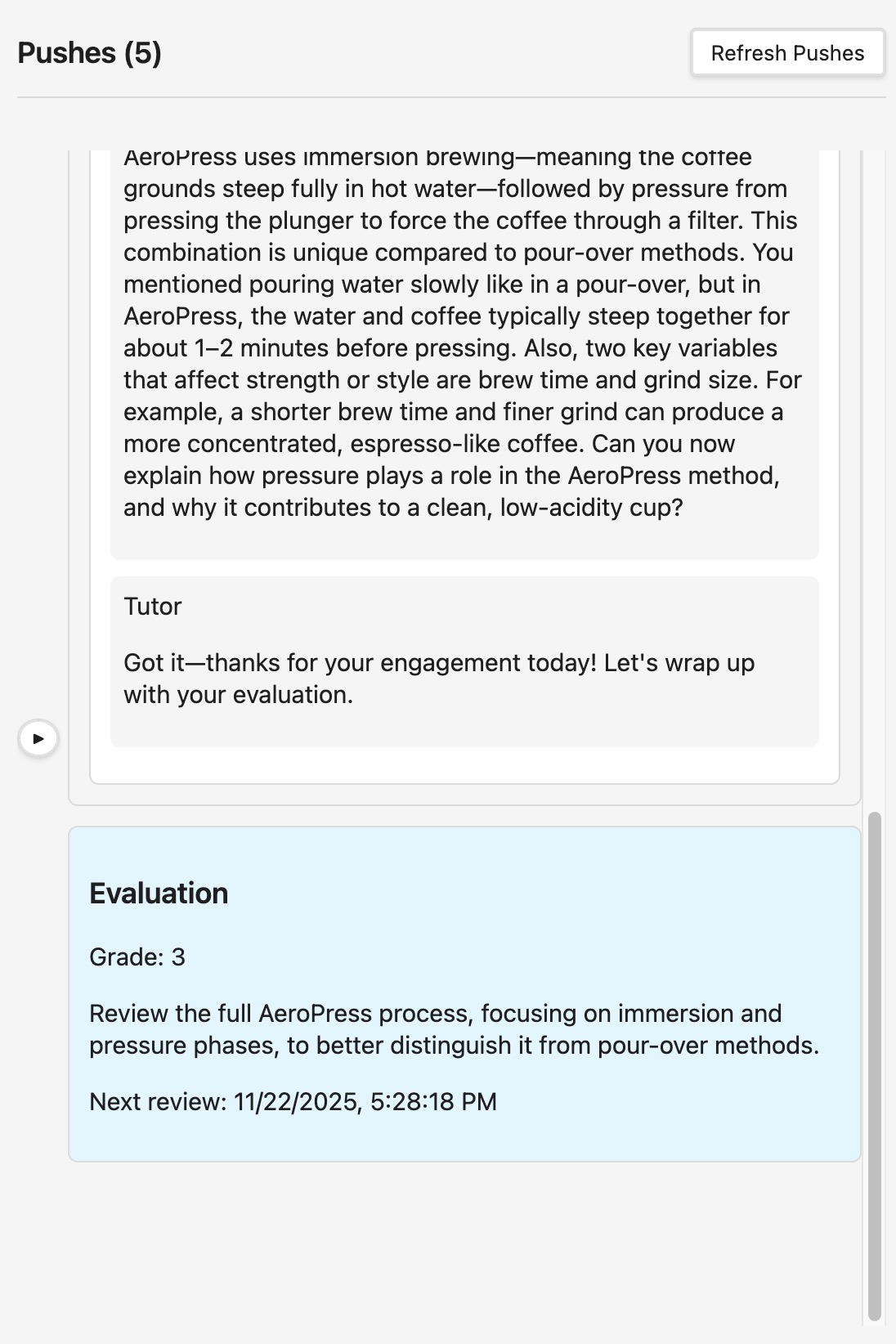 - Flexible Workflow: Choose between AI conversation or manual grading for each push