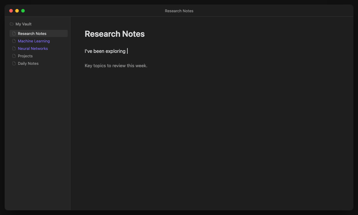 Type naturally. When you start typing a note name, ghost text appears inline. Press Tab to accept and create the link.