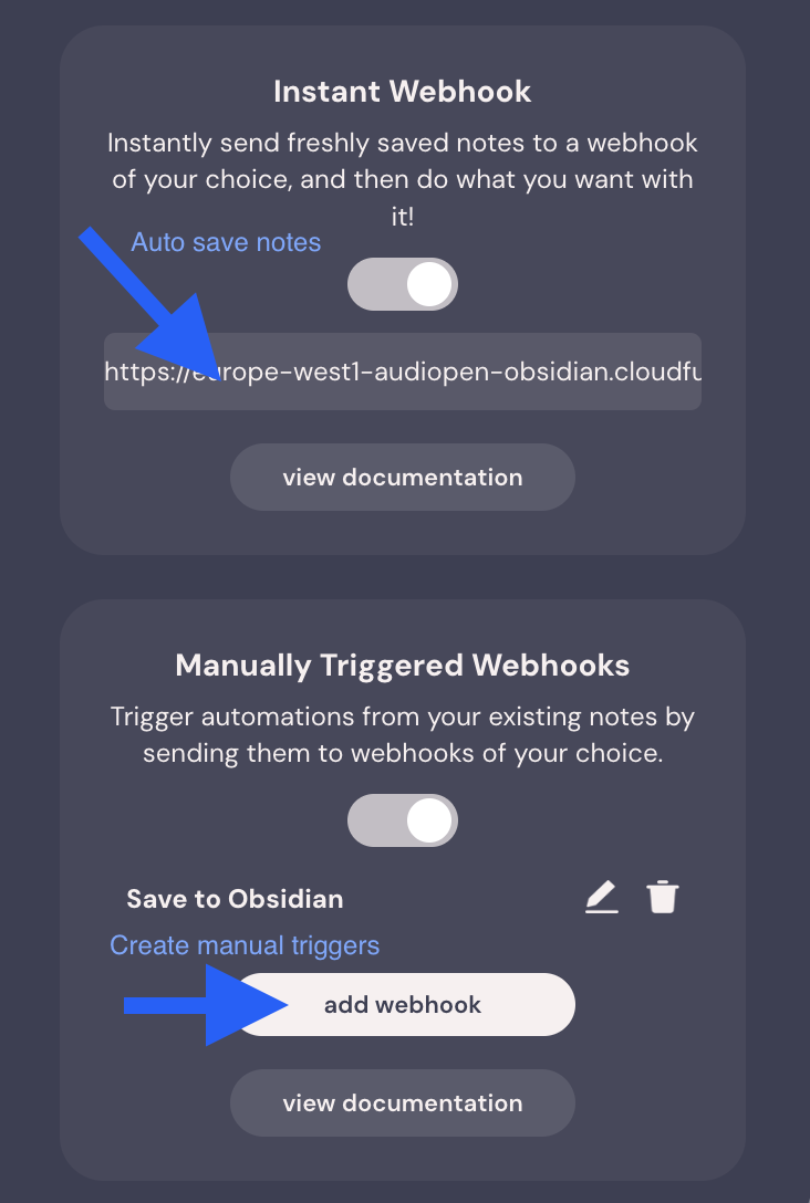LoudThoughtsplugin settings in Obsidian - Add the webhook url to AudioPen