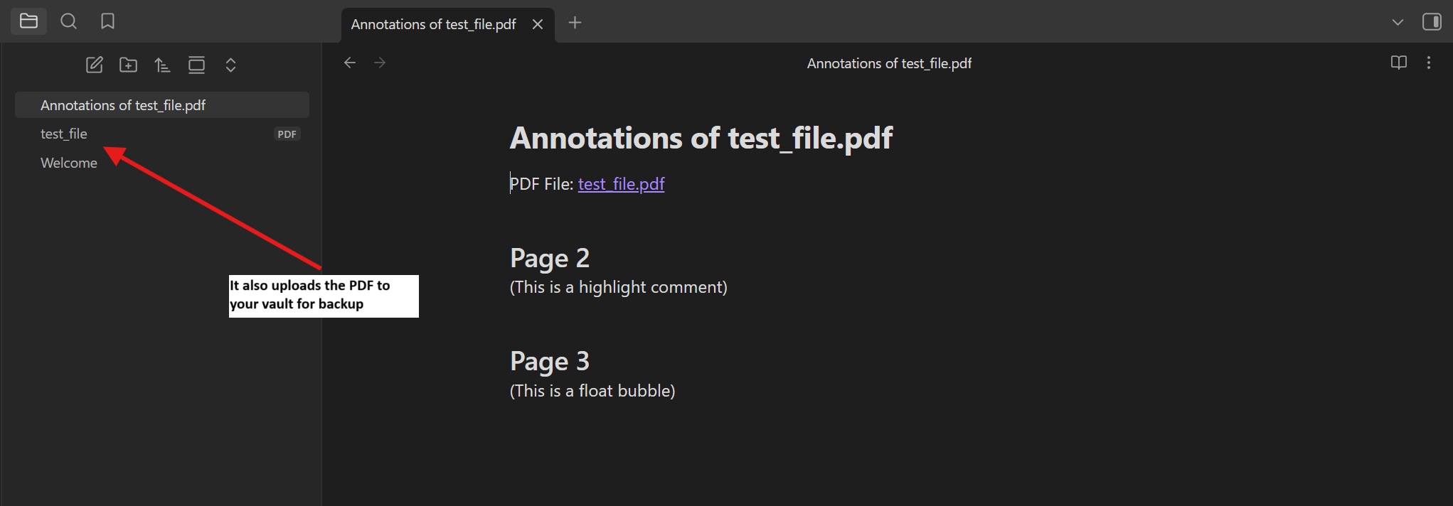 - The PDF is uploaded to your vault. And a .md file listing all comments is created.