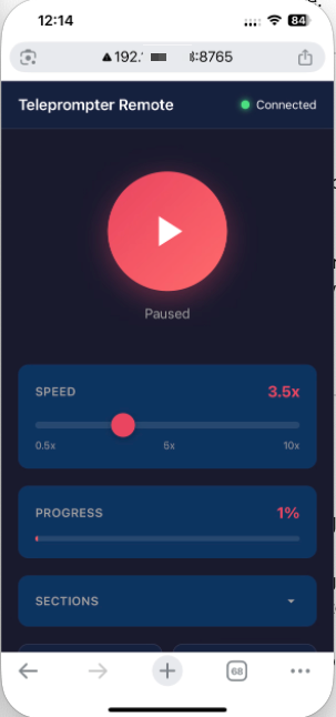 Control your teleprompter from any device on your network - phone, tablet, or second computer. Touch-friendly interface with full playback control and section navigation.