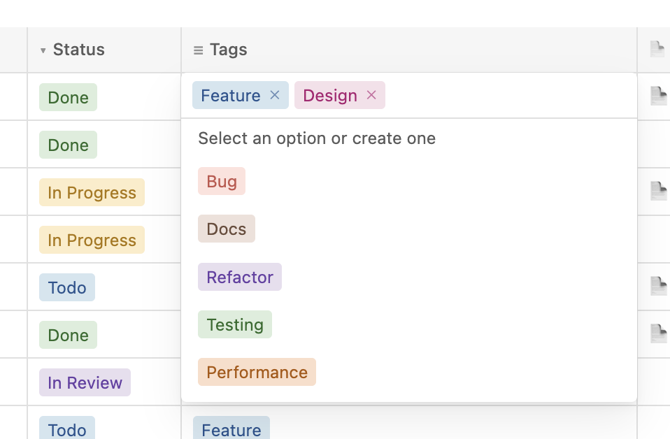 - Select & multi-select: color-coded tags with a dropdown picker