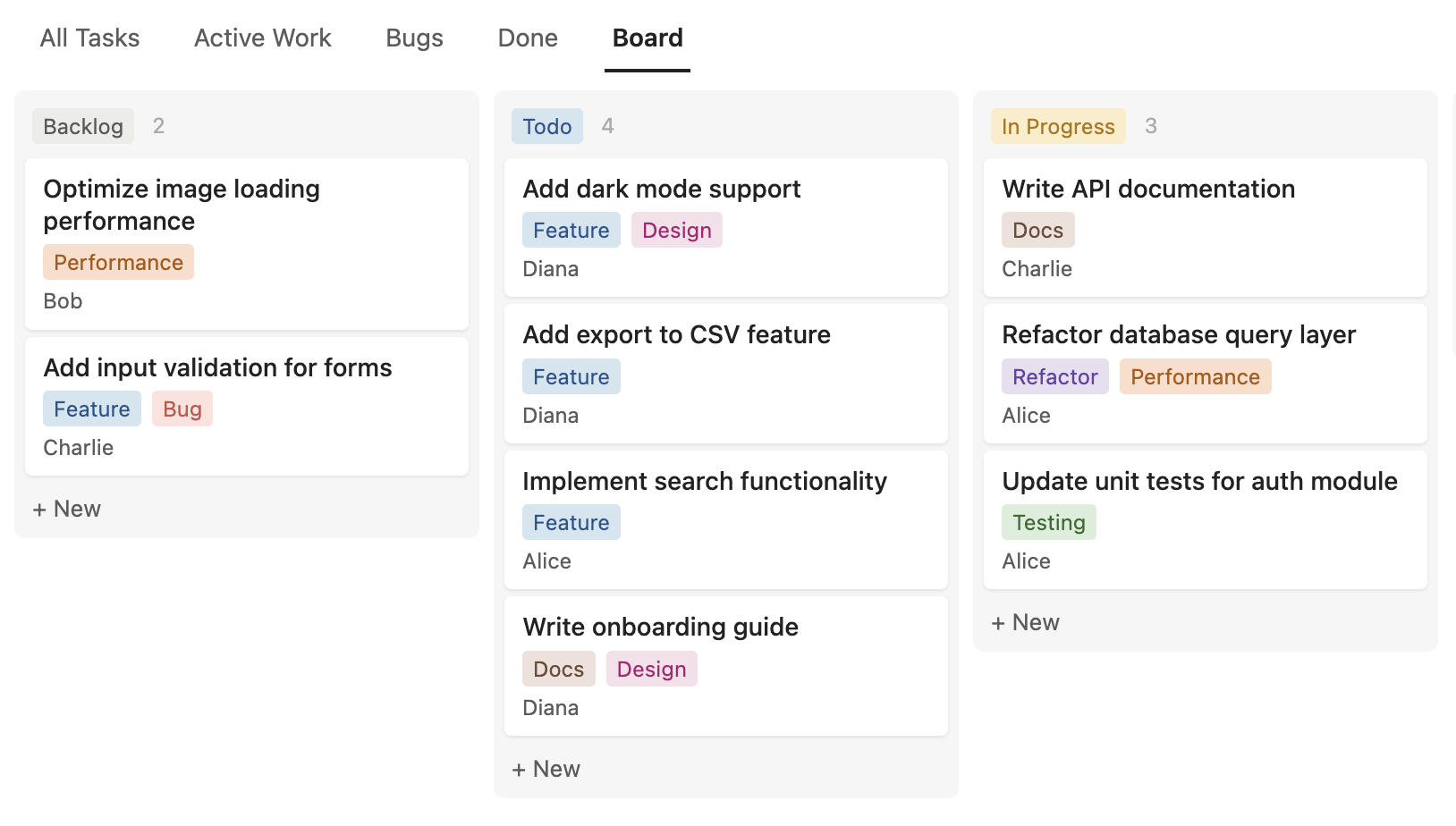 - Board layout: kanban-style board view grouped by a select column, with drag-and-drop between columns