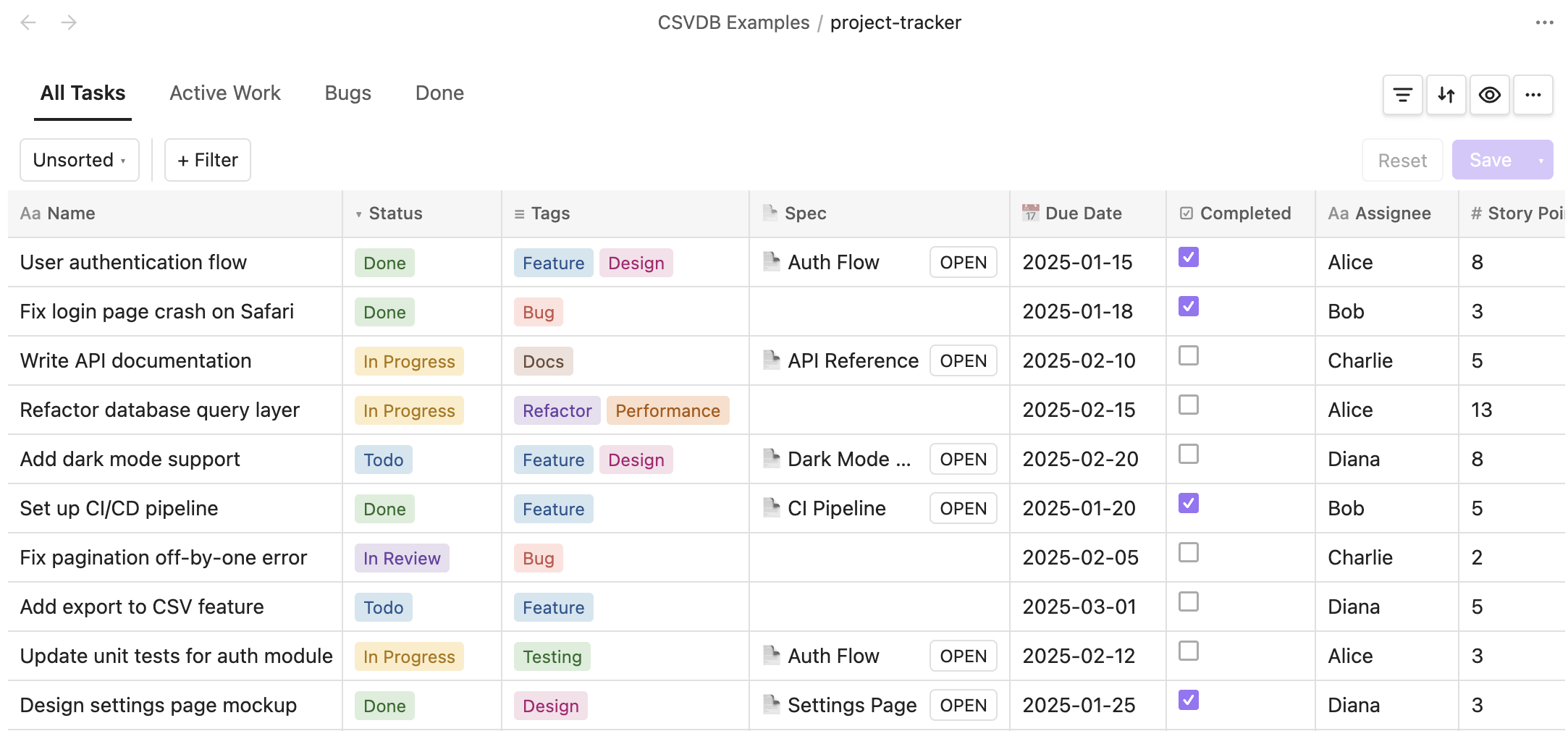 Interactive database view backed by CSV files, with rich column types, multiple views, sort & filter.