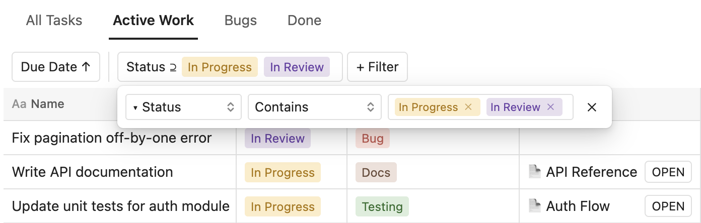 - Multiple views: create named views, each with its own sort, filter, and column visibility settings