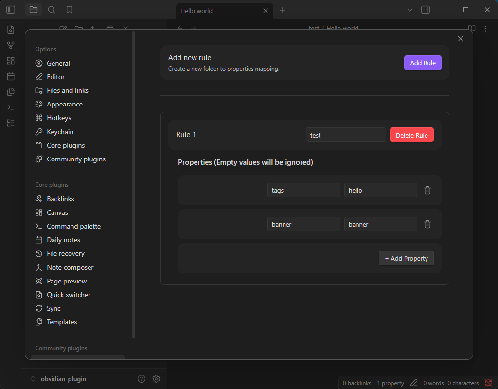 Note: If you create a rule with a key but leave the value blank, that property will be ignored during note creation. This allows you to keep a "master list" of potential properties in your settings without cluttering every note.