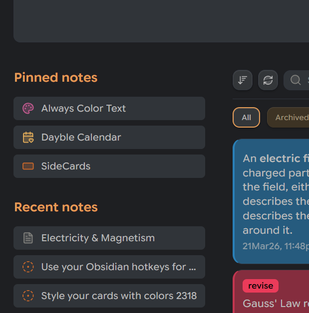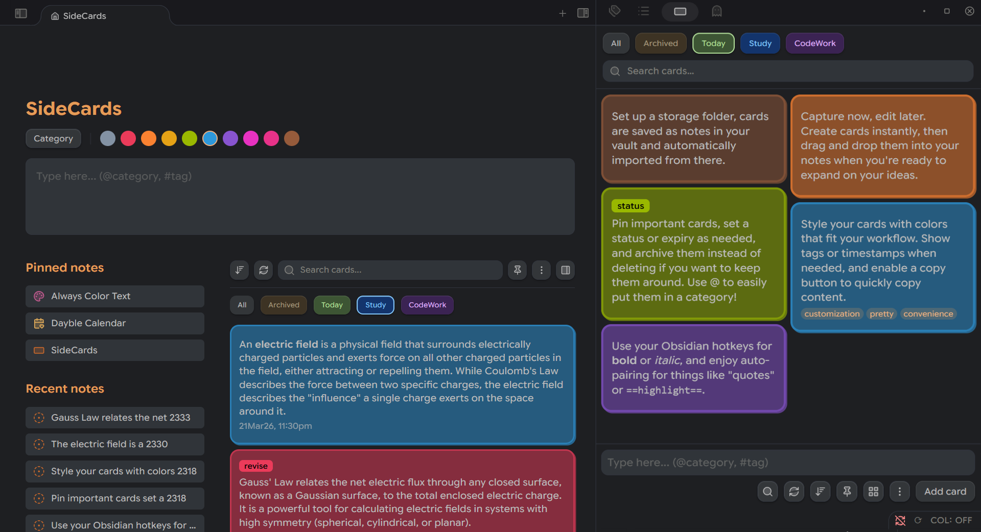 Quickly create cards in your Obsidian sidebar; color, tag, and drag them straight into your notes.