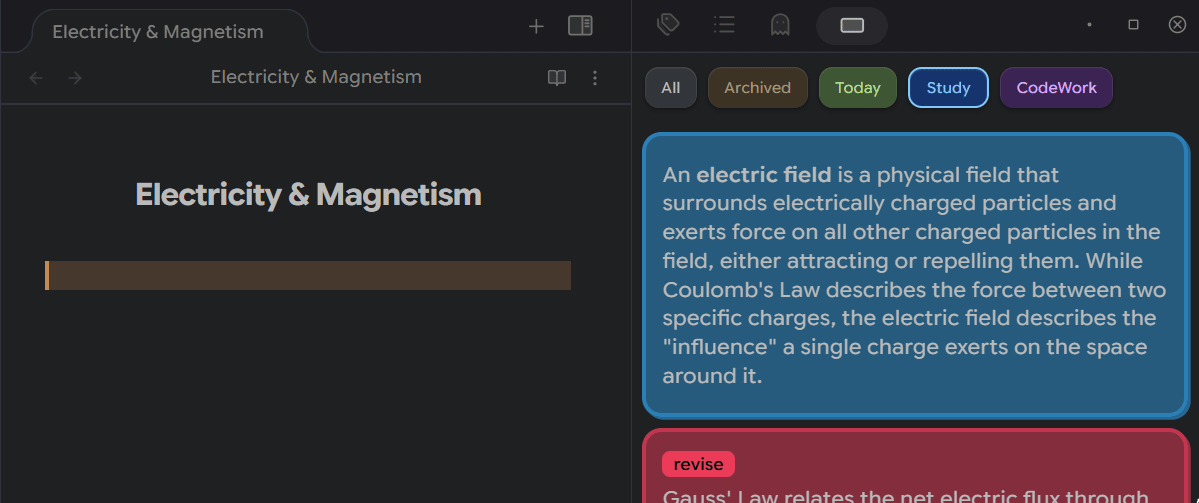 Quickly create cards in your sidebar, color, tag, and drag them straight into your notes.