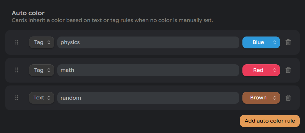 Automatically assign colors based on text content or tag matches.