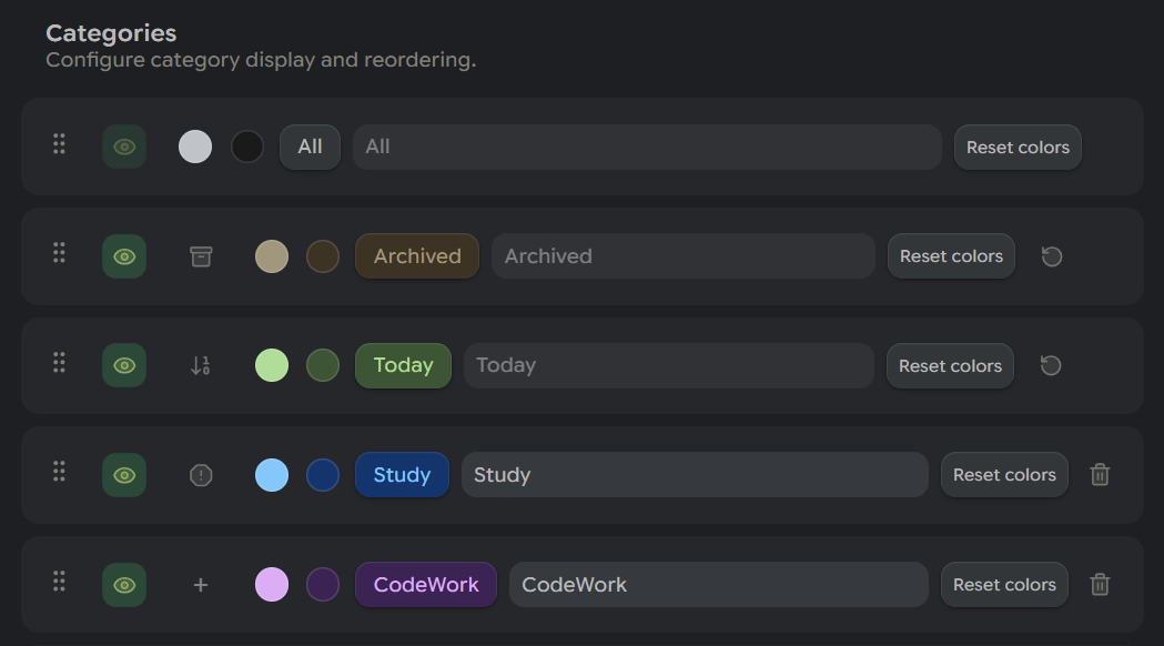 Build your own categories with custom labels, colors, and icons.