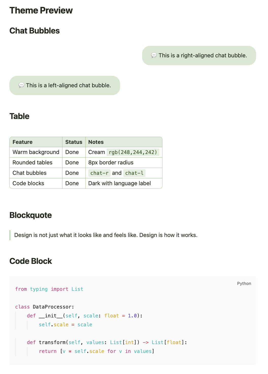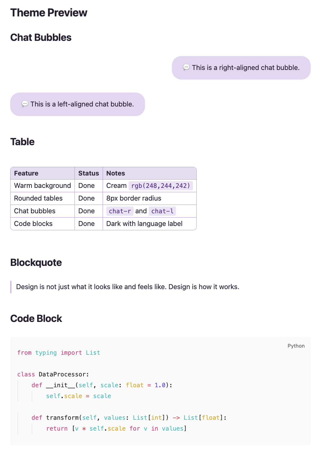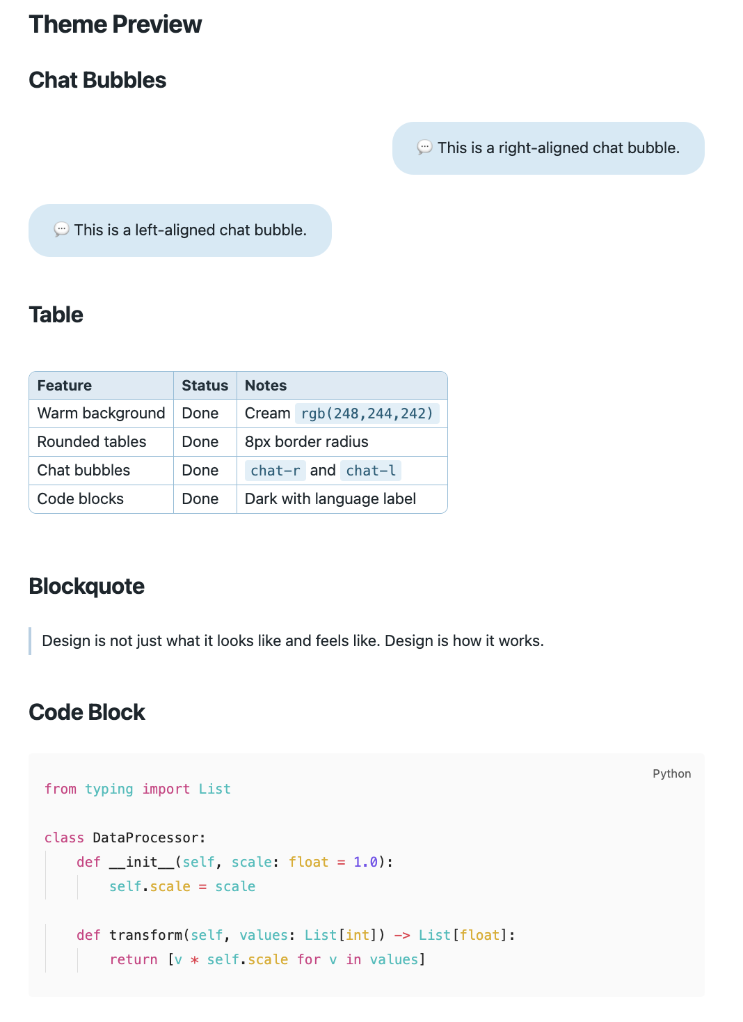 chat-rfor right-aligned,chat-lfor left-aligned) - Styled inline code, blockquotes, links, and lists