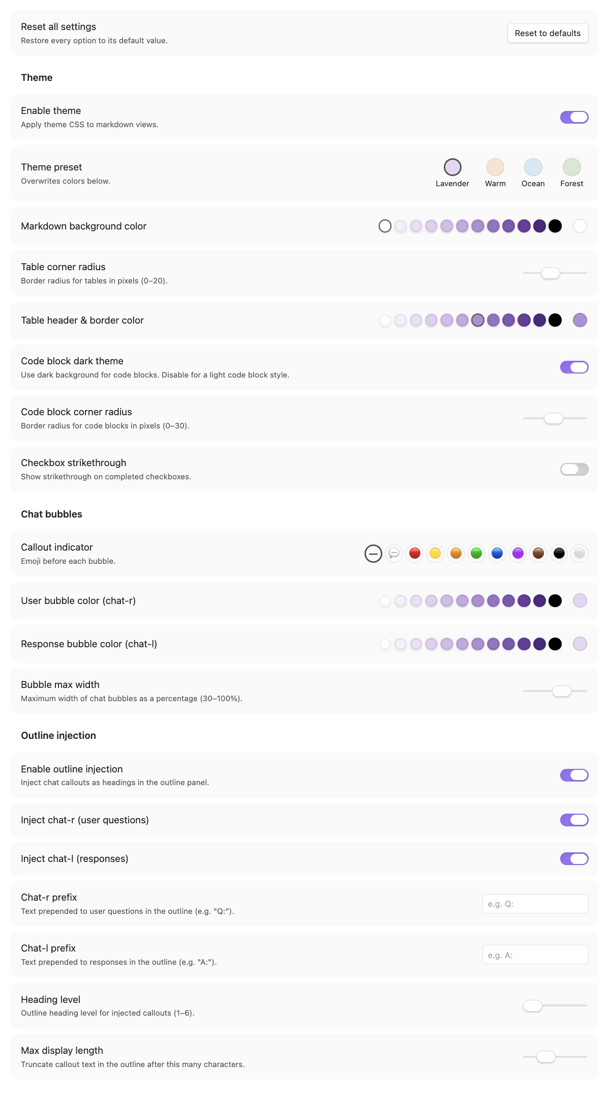 | Theme | Theme preset (Lavender / Warm / Ocean / Forest), enable/disable theme, markdown background color, table corner radius, table header & border color, code block dark/light theme, code block corner radius, checkbox strikethrough |