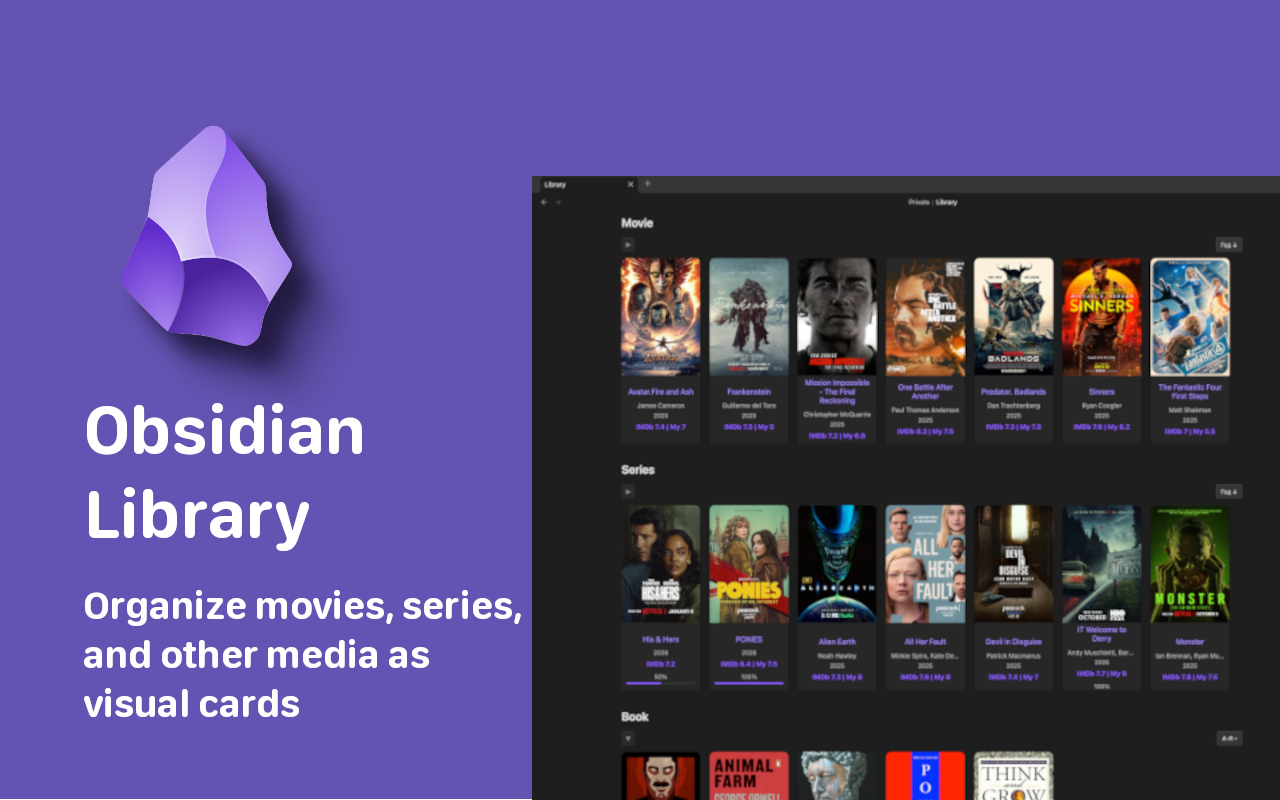 Organize your movies, series, and books into a stunning visual gallery directly within Obsidian.
