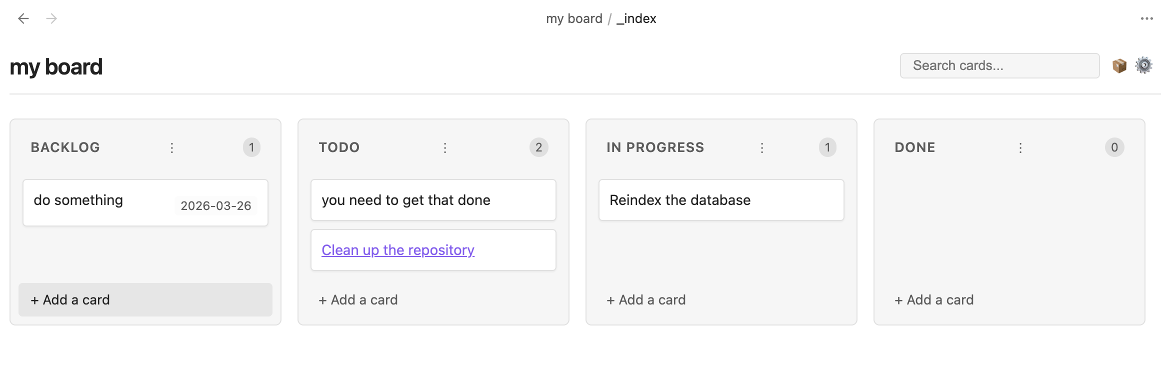 - Markdown-Backed: All your board data is stored in standard Markdown files.
