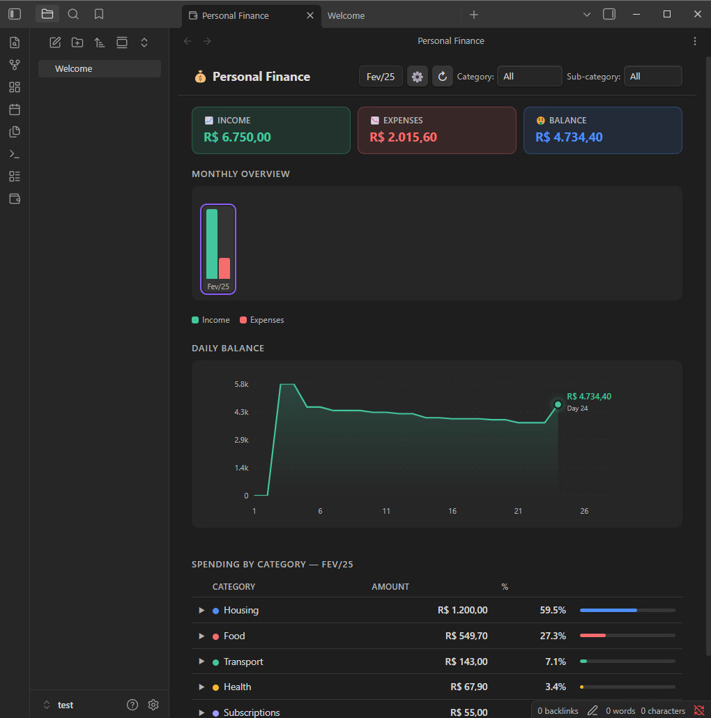 Track and visualize your monthly finances directly in Obsidian β summary cards, daily balance chart, monthly evolution, and spending by category, all powered by a simple CSV file.