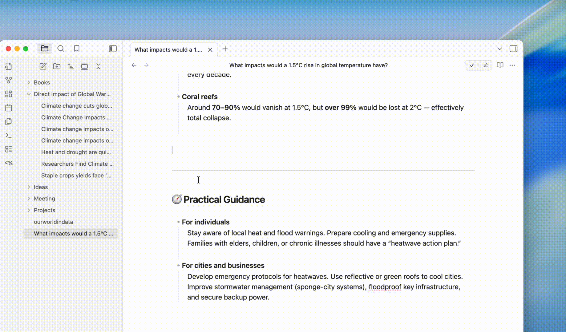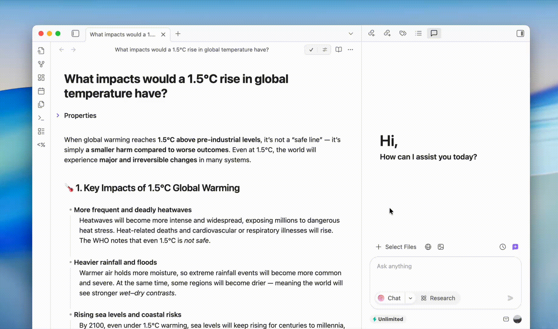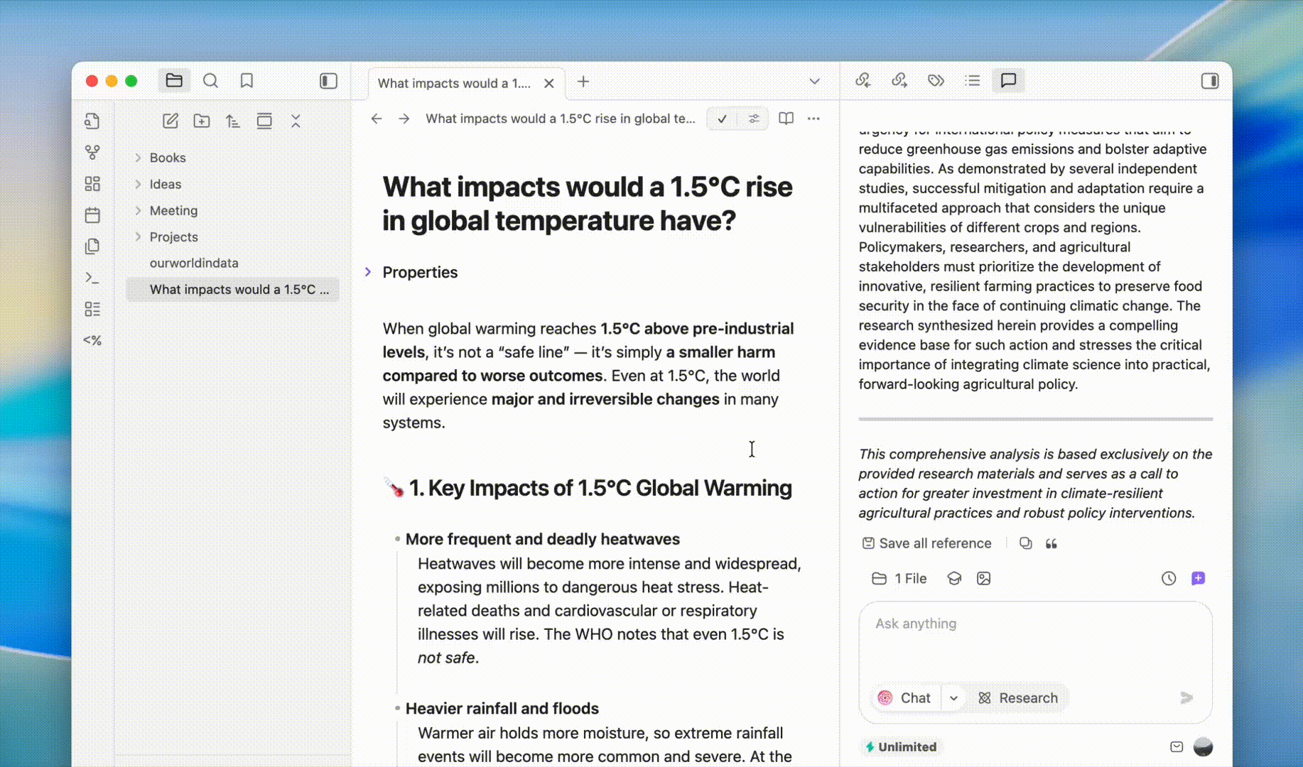 Ask questions about your notes and receive AI-powered answers with inline citations to the original content. Context persists across conversations and multiple files for seamless knowledge exploration.