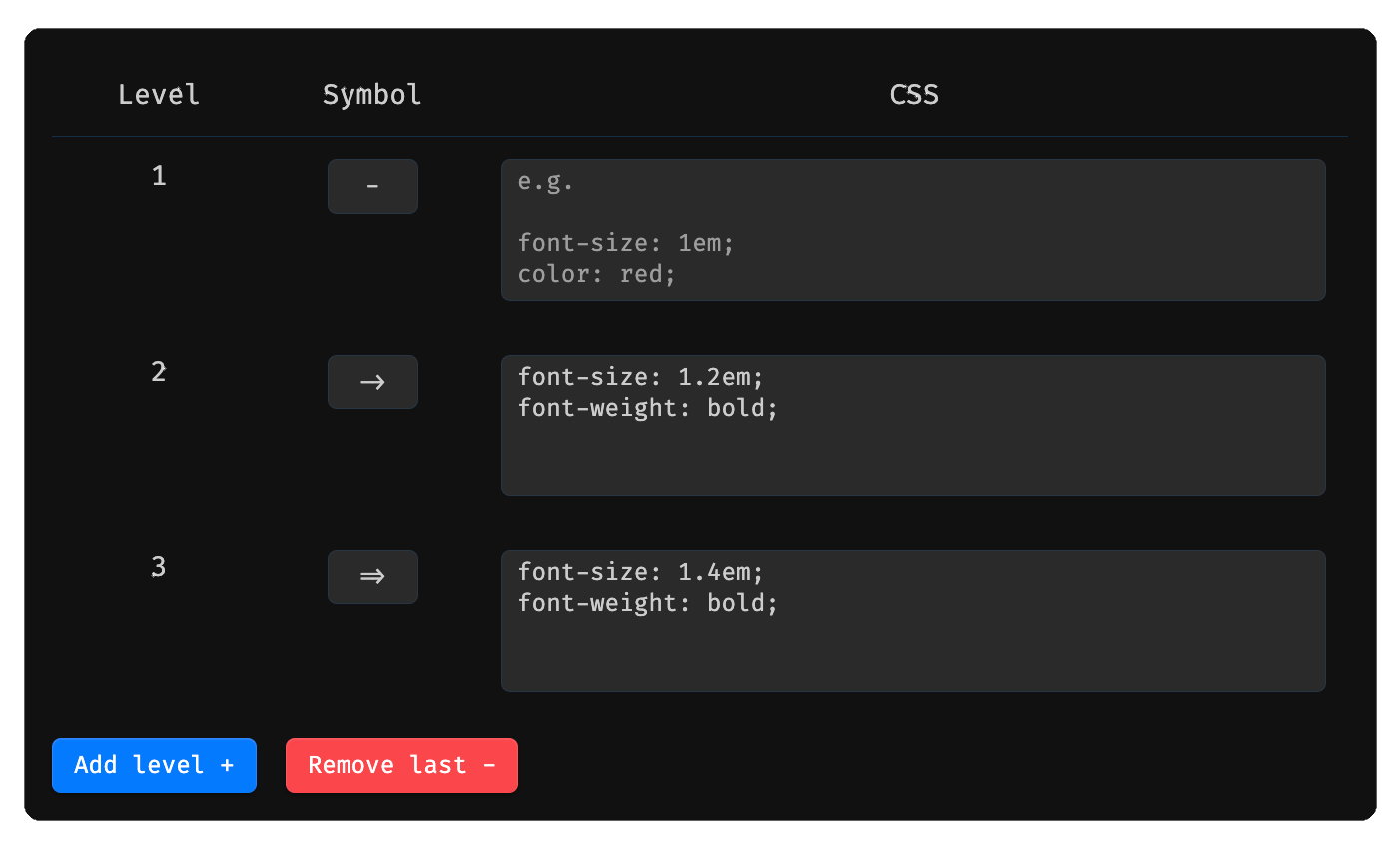 Define the bullet symbol and CSS for each indentation level. Add or remove levels as needed using the Add level + and Remove last - buttons.