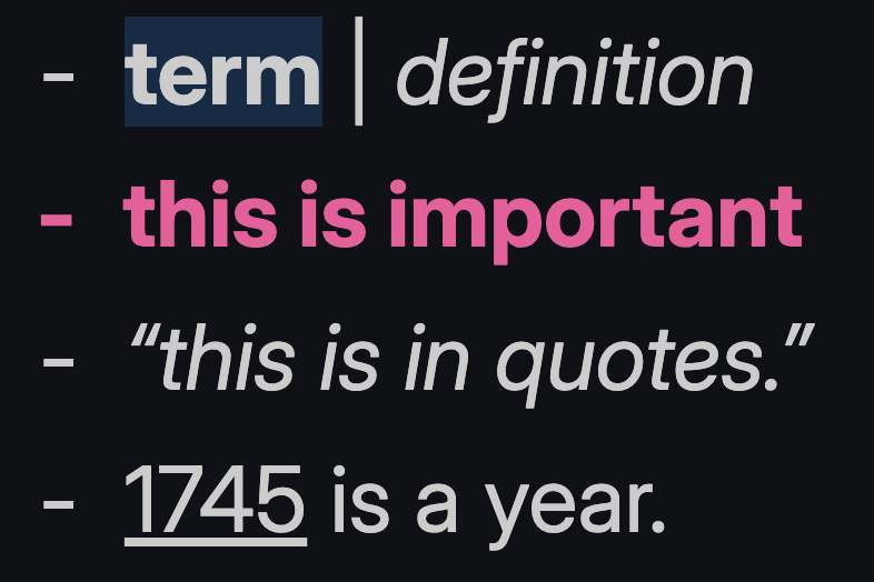 Term | Definitionsyntax bolds and highlights the term and italicizes the definition. - Important Lines: Lines ending with