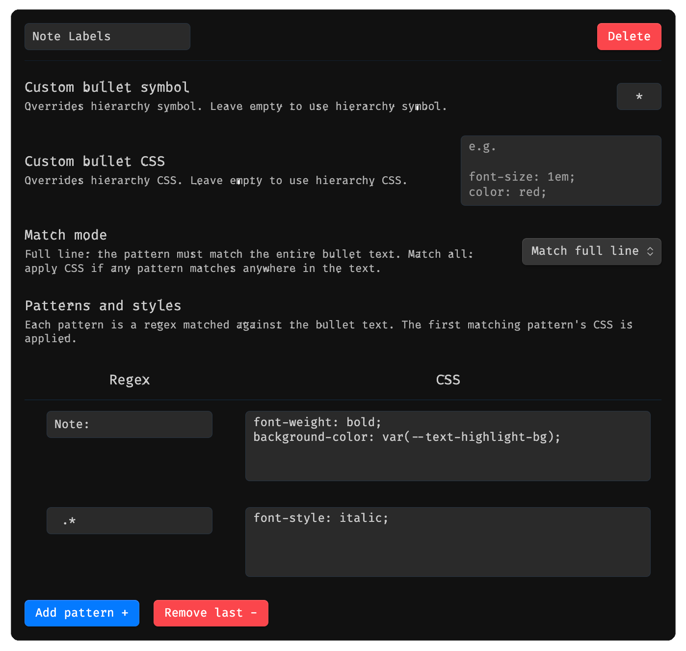 Create custom rules that match bullet text using regex patterns and apply CSS styles. Each rule supports: