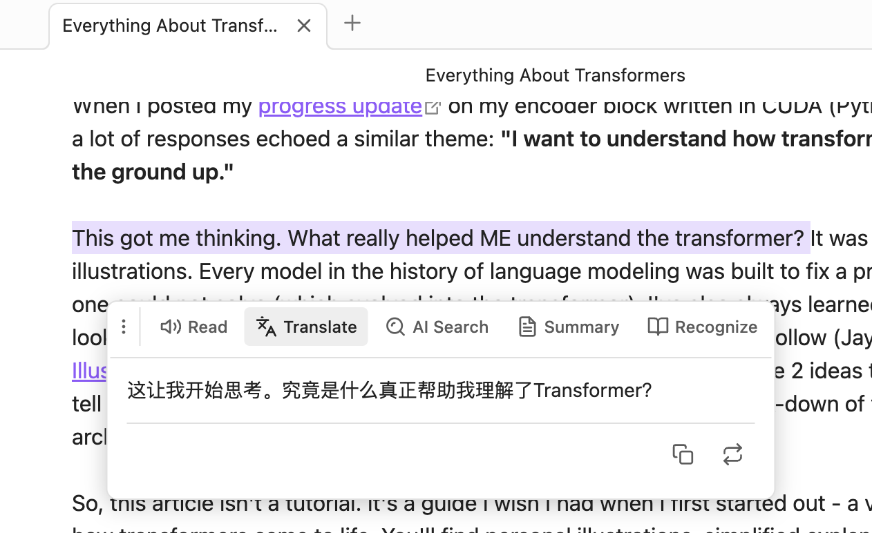 一个强大的 Obsidian 插件,为选中的文本提供悬浮 AI 工具栏,集成 AI 驱动的翻译、解释、总结和识词功能,同时支持浏览器内置和 API 双模式的文本朗读。
