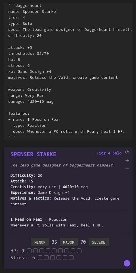Make your own homebrew adversary by creating a daggerheart code block, or edit an inserted one by clicking the </> button in the top-right corner.