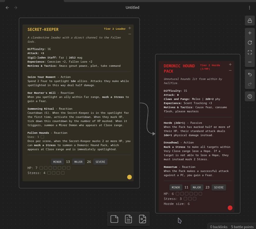 Build out full encounters (works in a canvas too!) and track their HP & stress during a session. Marked HP & stress are preserved even after you close Obsidian.