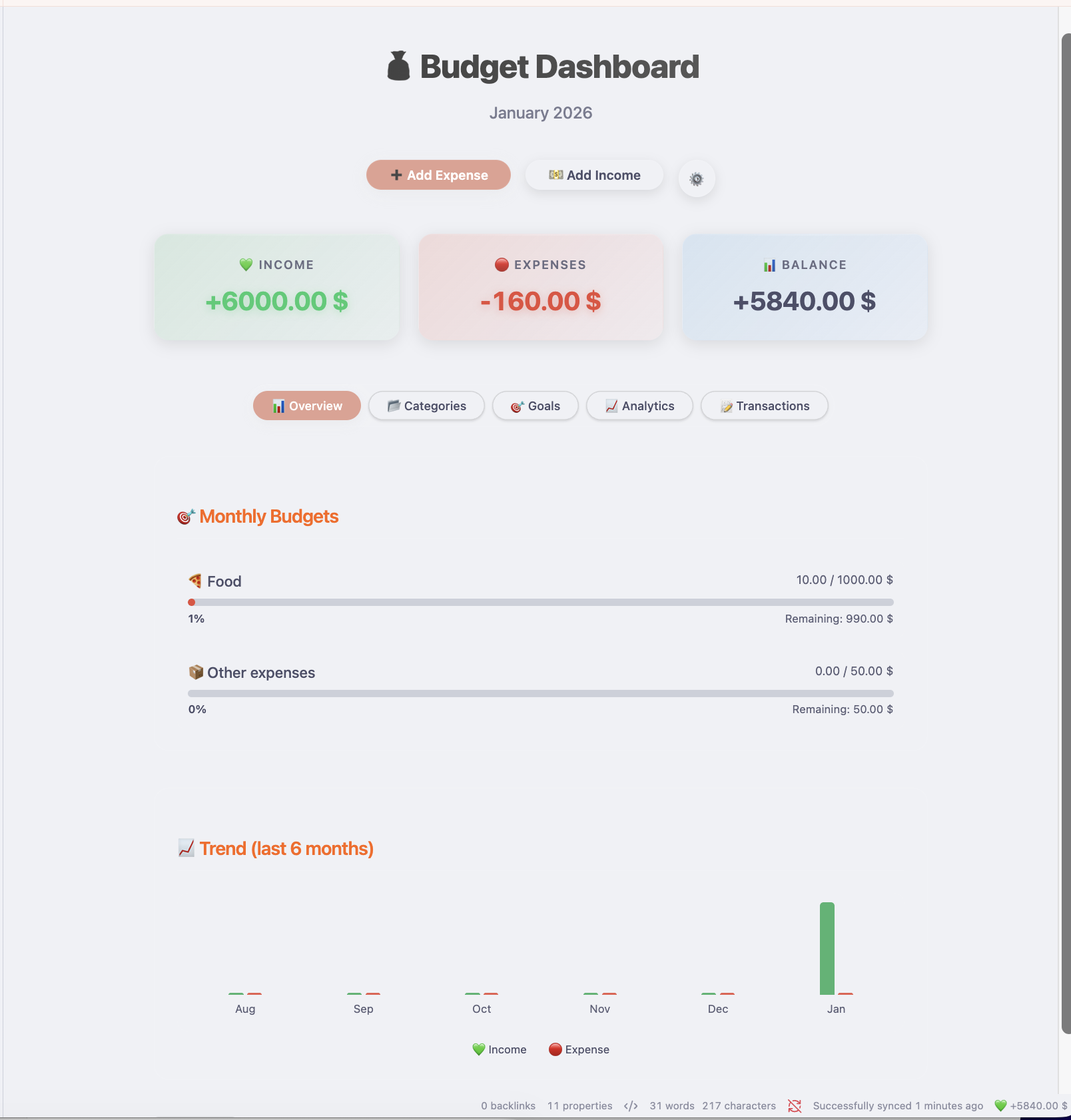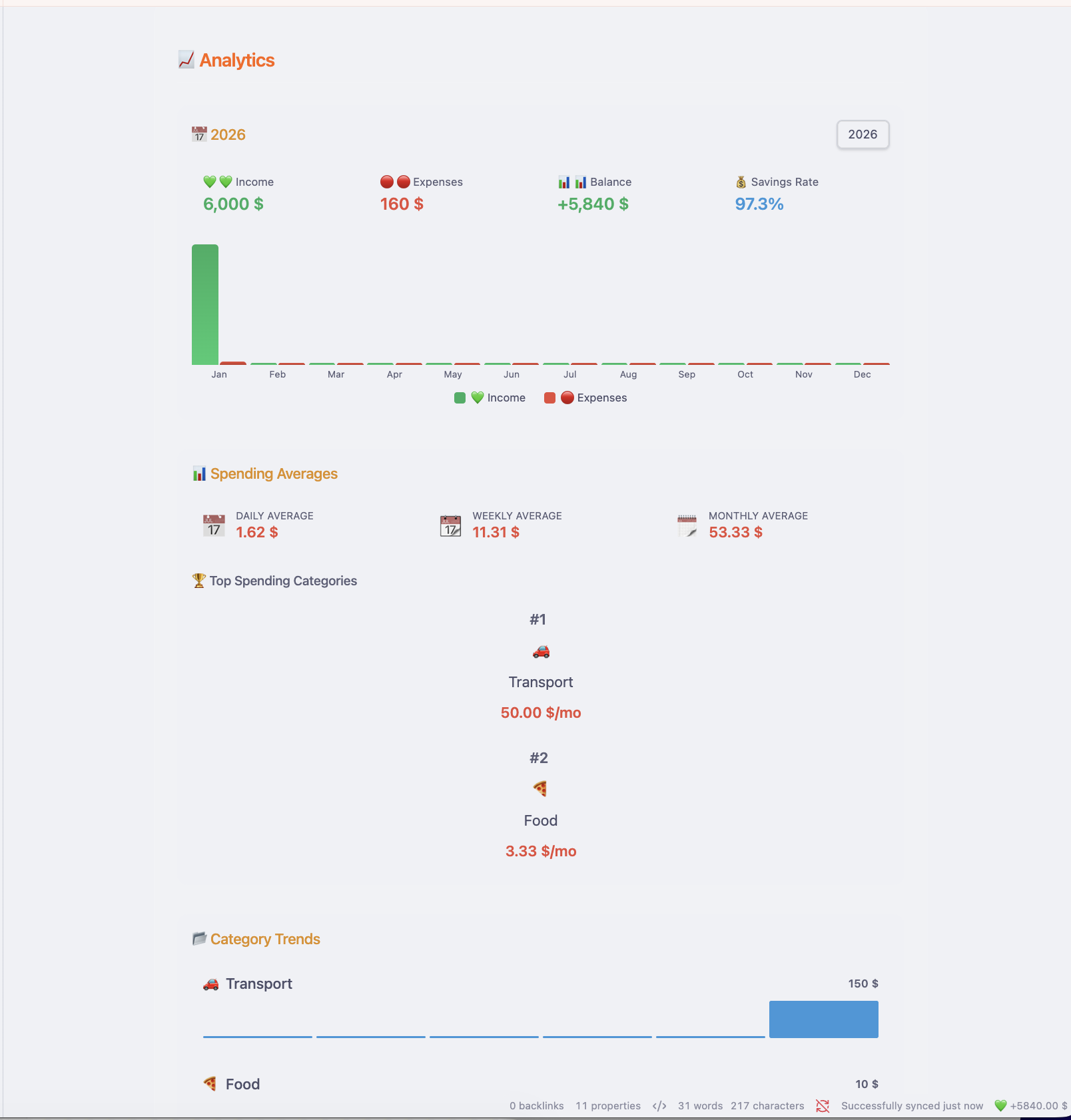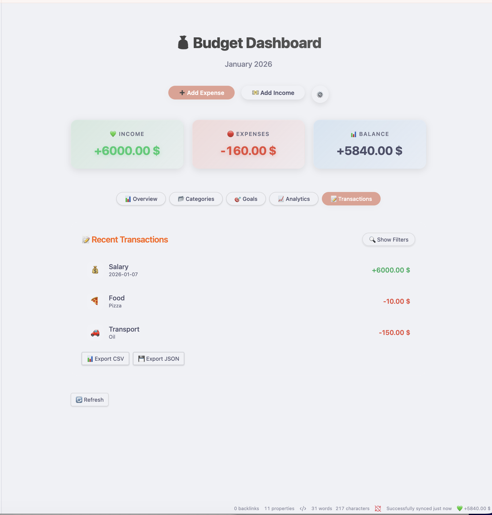 - Savings Rate is automatically calculated based on your income vs. expenses.