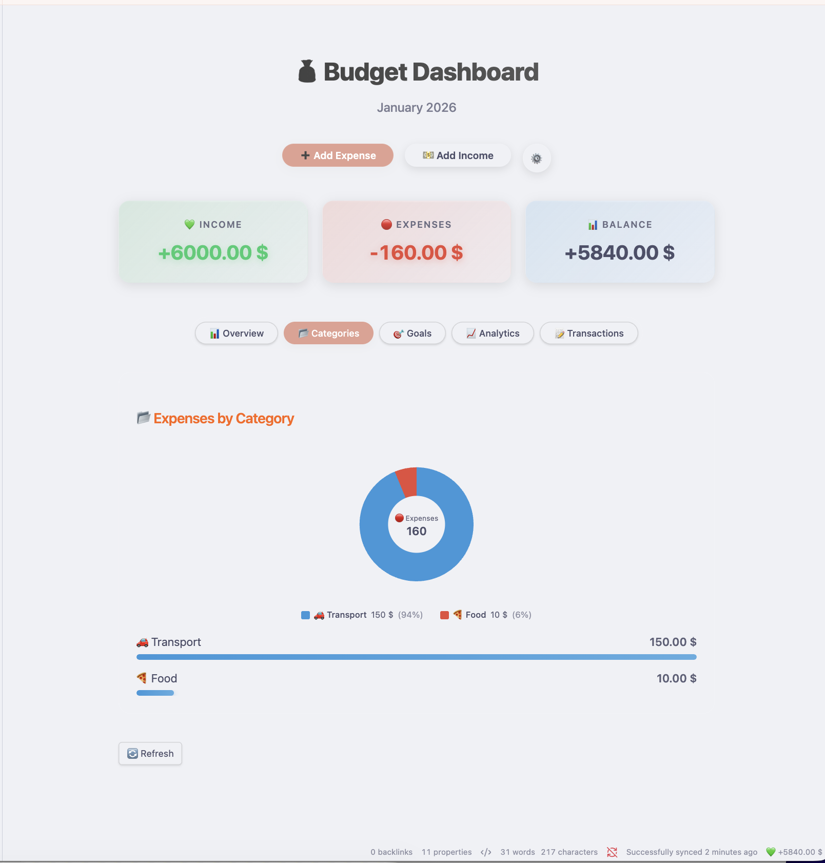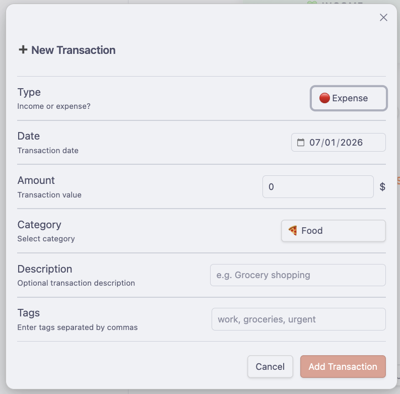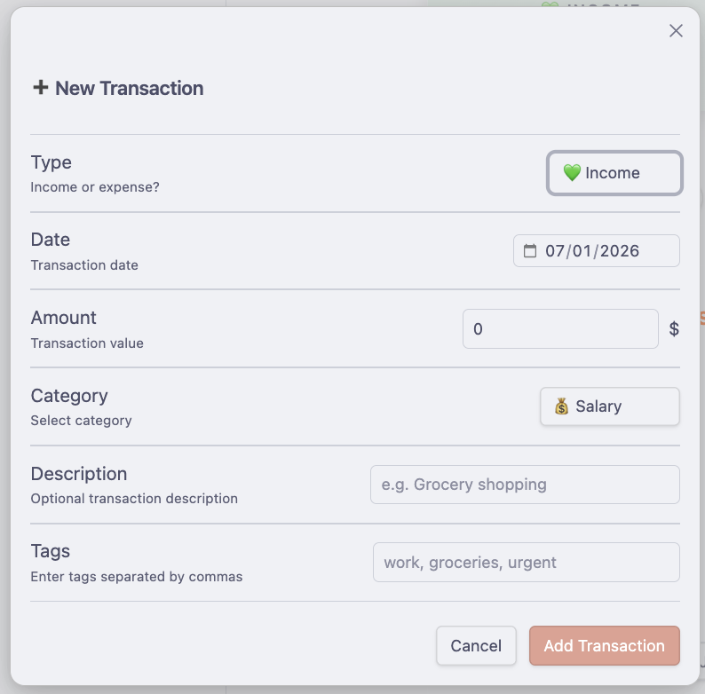 Quickly add income and expenses with intuitive forms. Support for recurring transactions included.