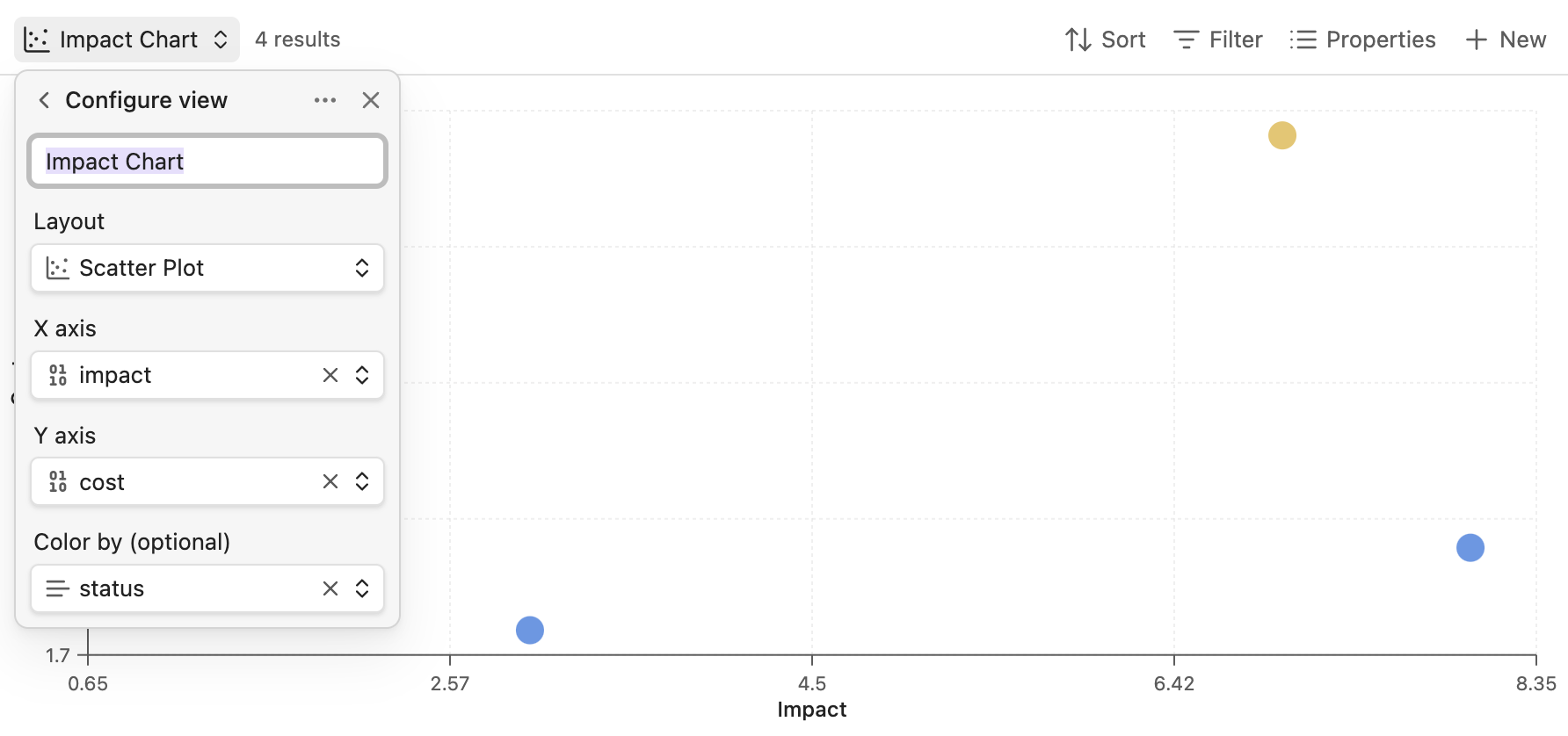 Visualize notes as points on a 2D chart using any numeric properties. Find patterns, spot outliers, prioritize visually.