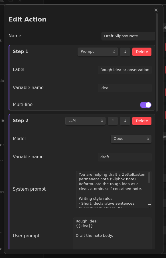 | 2 | LLM (Opus) | Drafts the note body from {{idea}}, variable: draft |