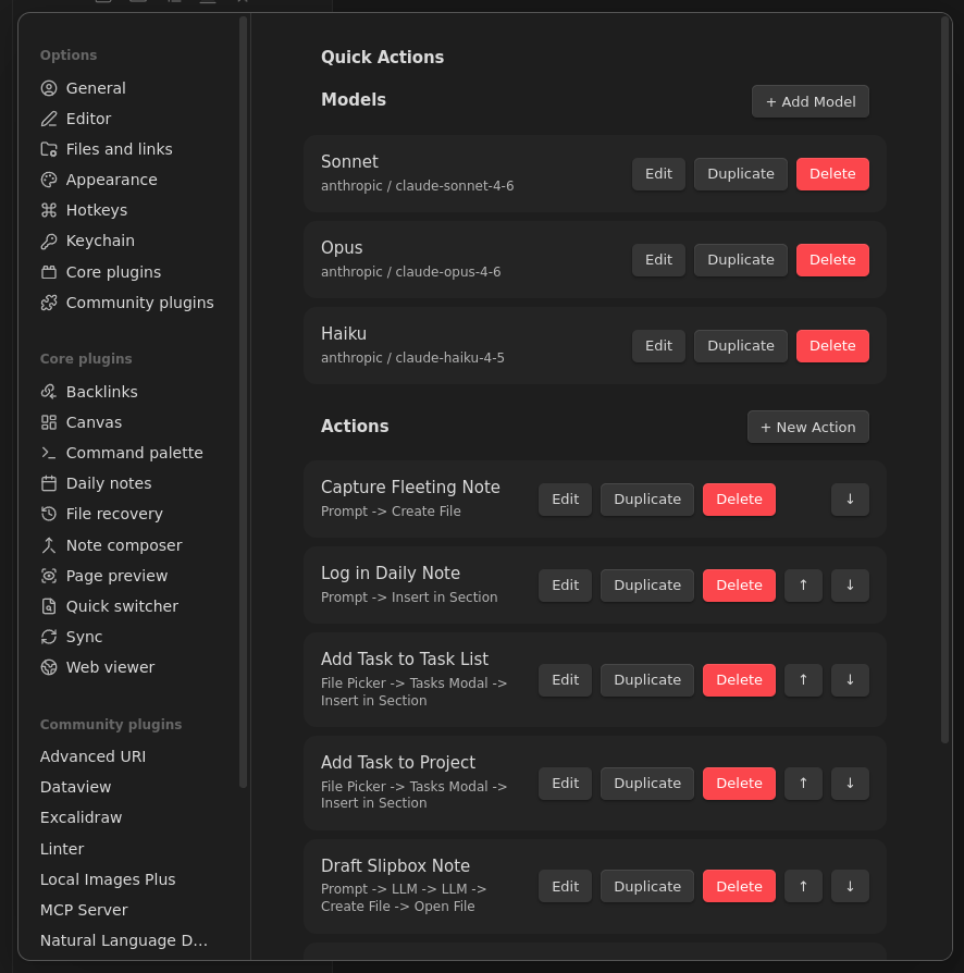 Quick Actions can call LLM APIs as pipeline steps, letting you build AI-assisted workflows entirely within Obsidian.