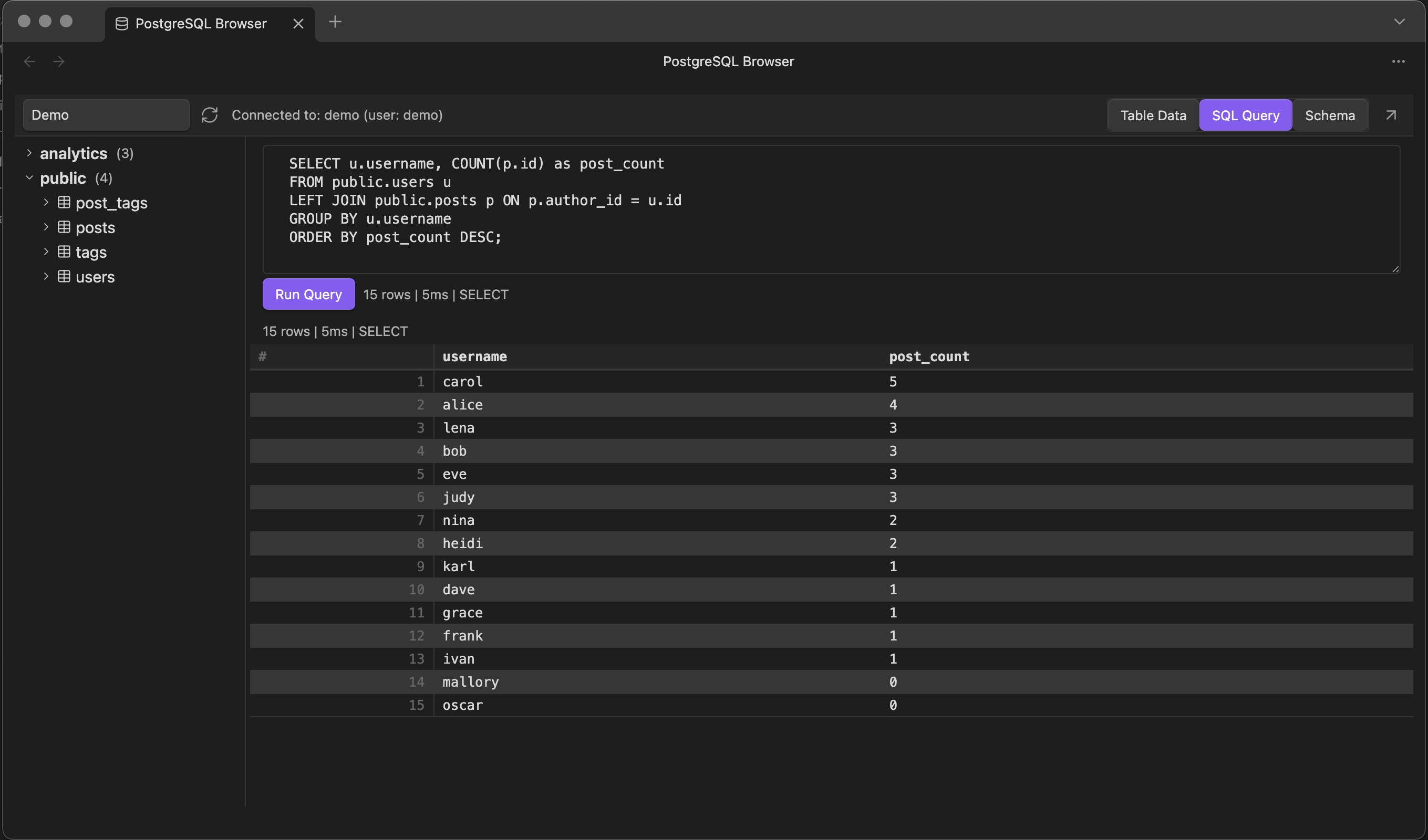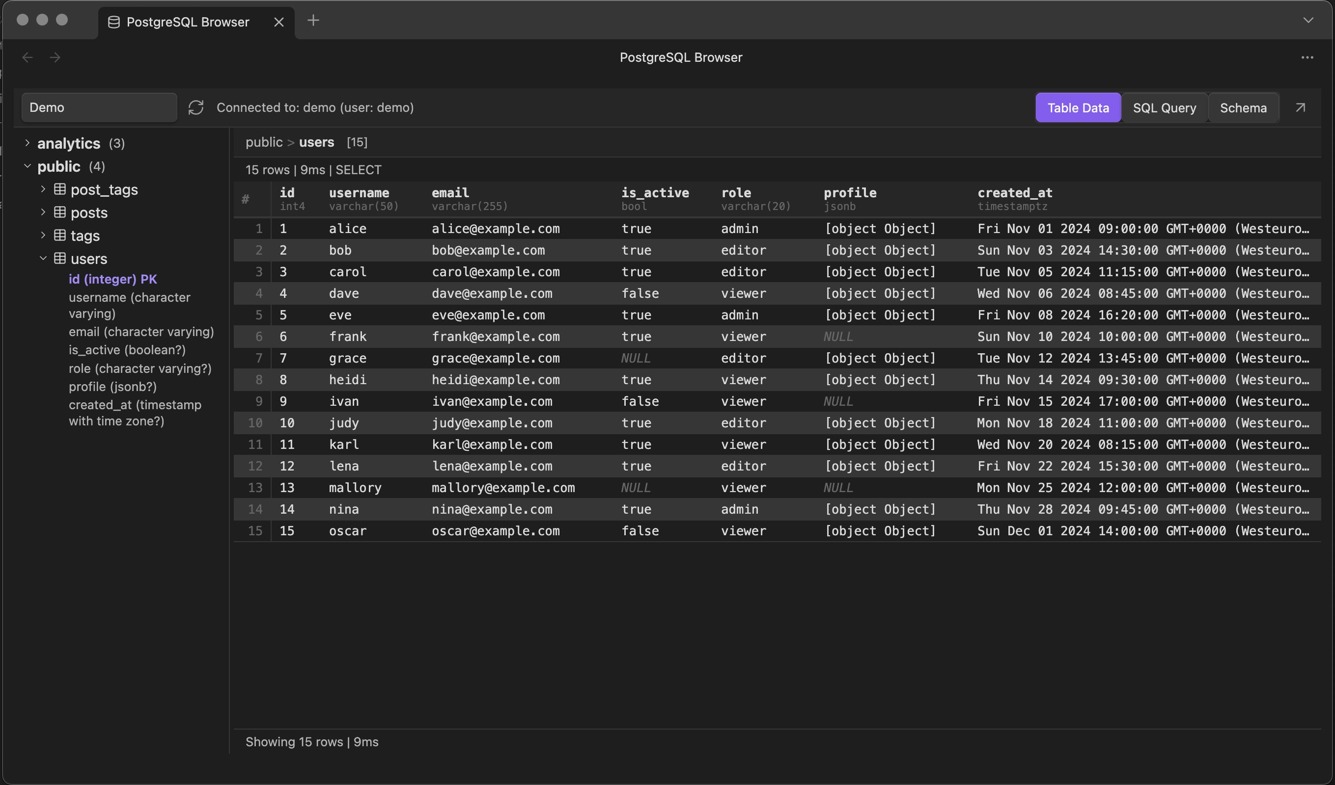 Browse PostgreSQL schemas, preview table data, and run SQL queries.
