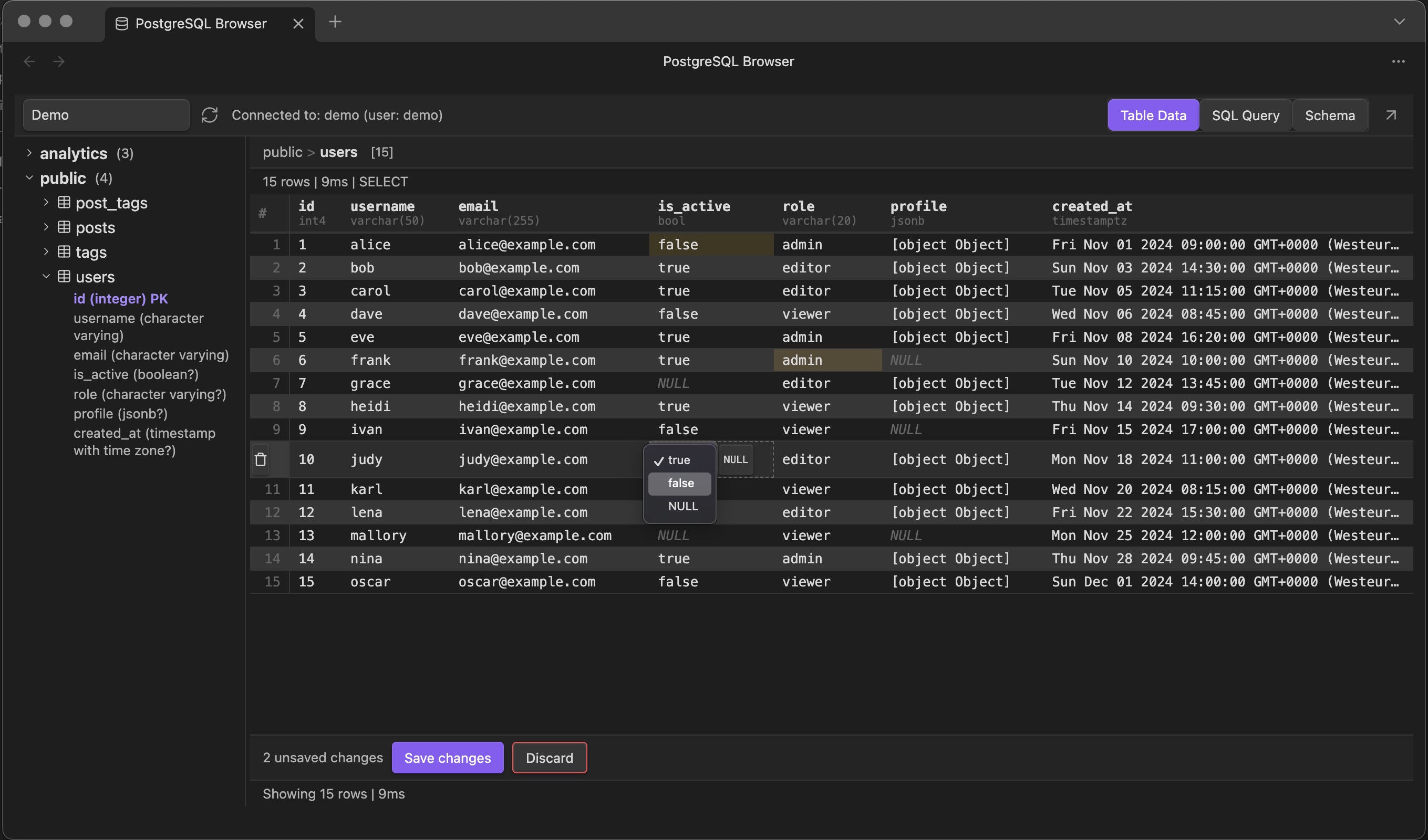 - Double-click a cell to edit it inline (editors adapt to the column type: toggle for booleans, dropdown for enums, JSON editor for JSON columns, etc.)
