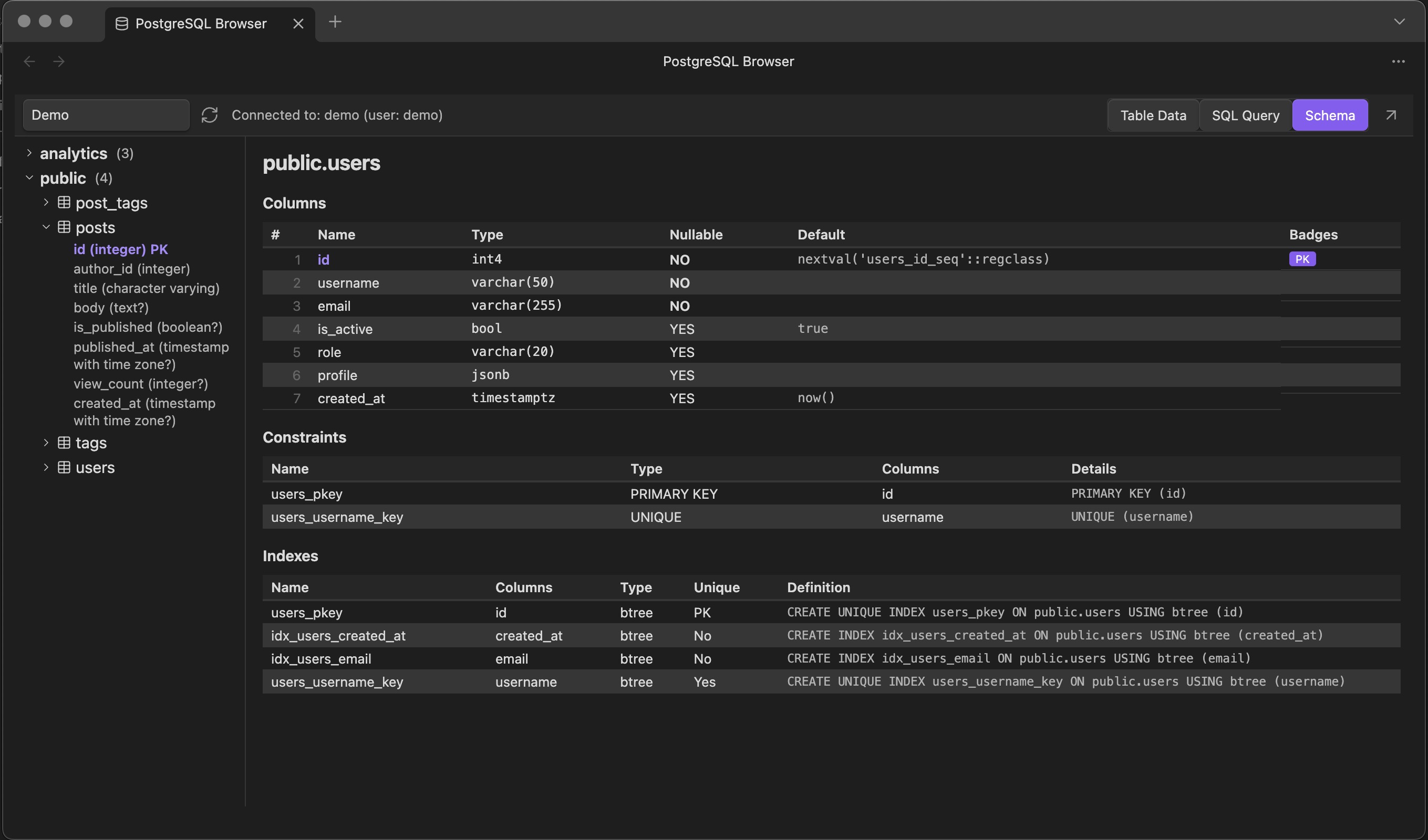 - Schema detail view -- columns, constraints, indexes, foreign key relationships, and estimated row count for any table