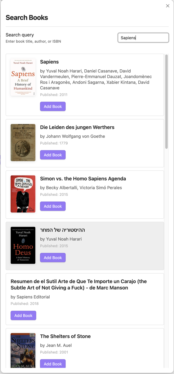 - Auto-fetch metadata (title, author, publisher, ISBN, cover)