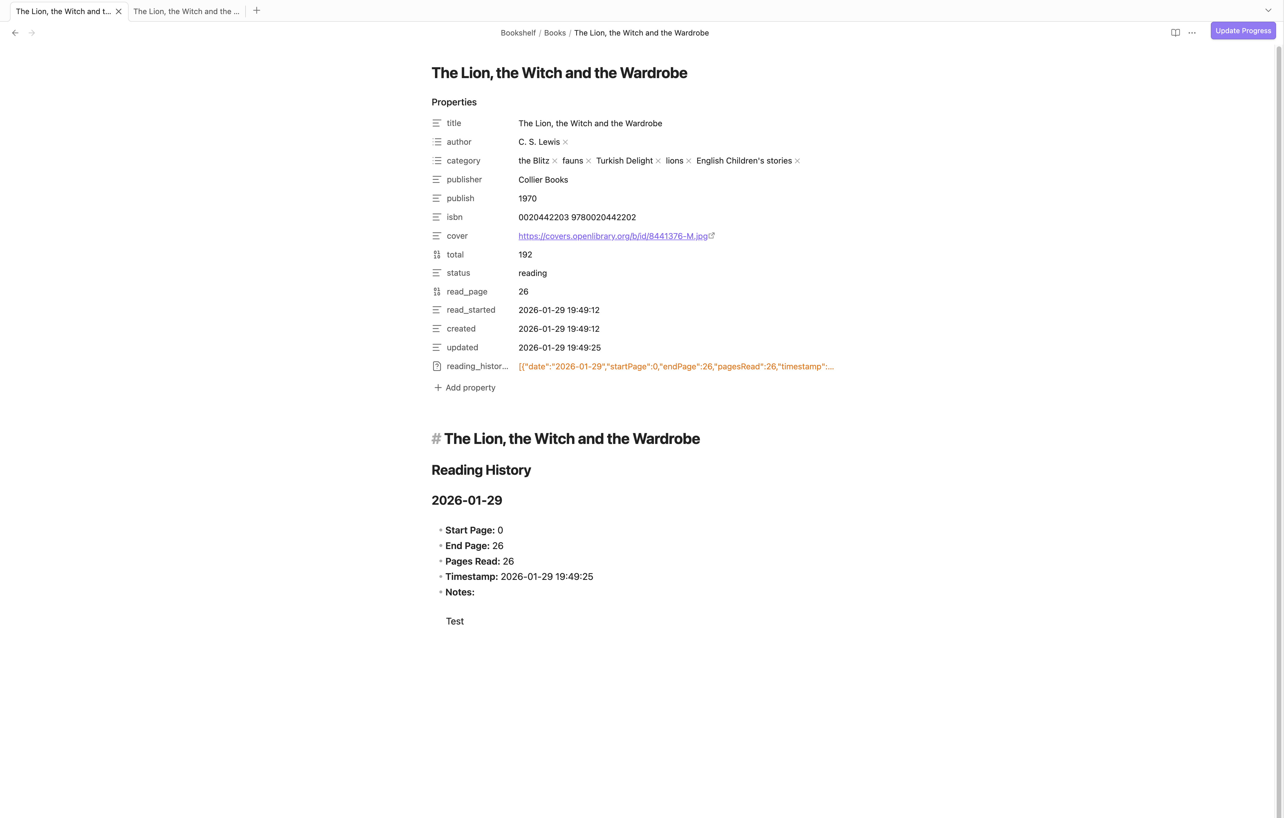title: Book titleauthor: List of authorscategory: List of categories/genrespublisher: Publisher namepublish: Publication dateisbn: ISBN numbercover: Cover image URLtotal: Total pagesstatus: Reading status (unread,reading,finished)read_page: Current page numberread_started: Date when reading startedread_finished: Date when finished (null if not finished)created: Note creation timestamp (immutable)updated: Last update timestampreading_history_summary: Array of reading sessions