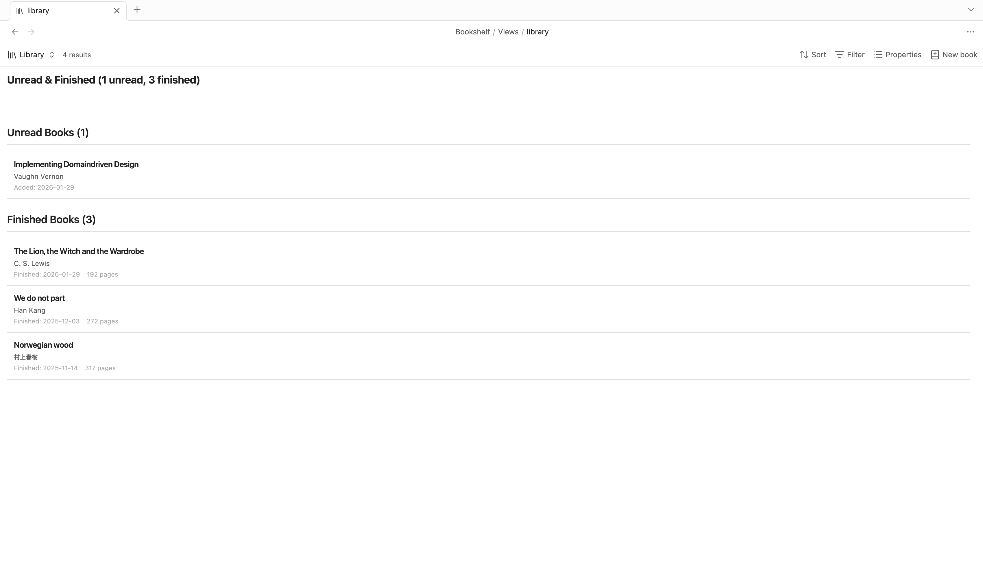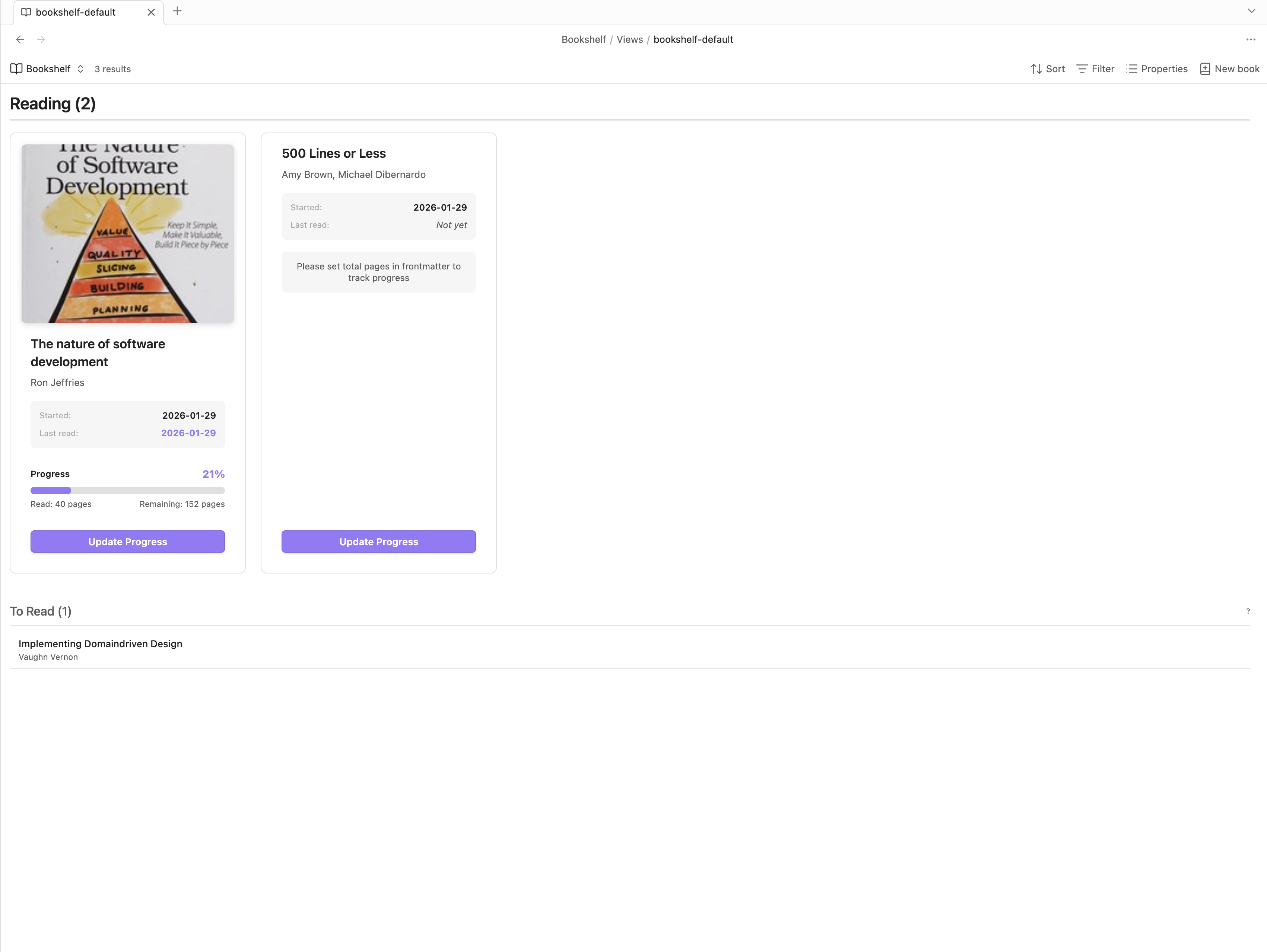 Bookshelf helps you manage your personal library in Obsidian. Each book is stored as a Markdown note with YAML frontmatter, making it easy to integrate with your existing notes and workflows. Search and import books directly from Open Library API with automatic metadata fetching.