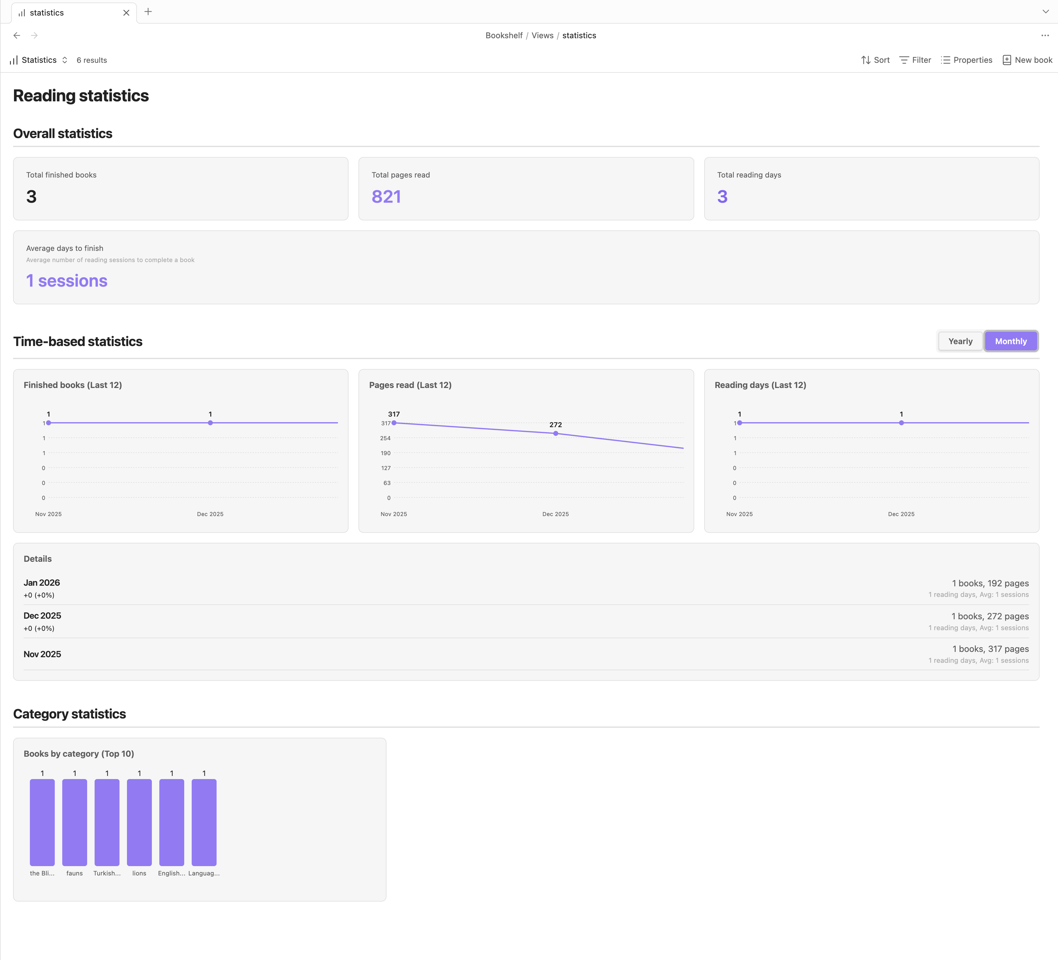 Track your reading progress with page numbers and notes, which are automatically recorded in your book notes. View your library through customizable Bases views (Bookshelf, Library, Statistics) that let you organize books by reading status and analyze your reading habits over time.