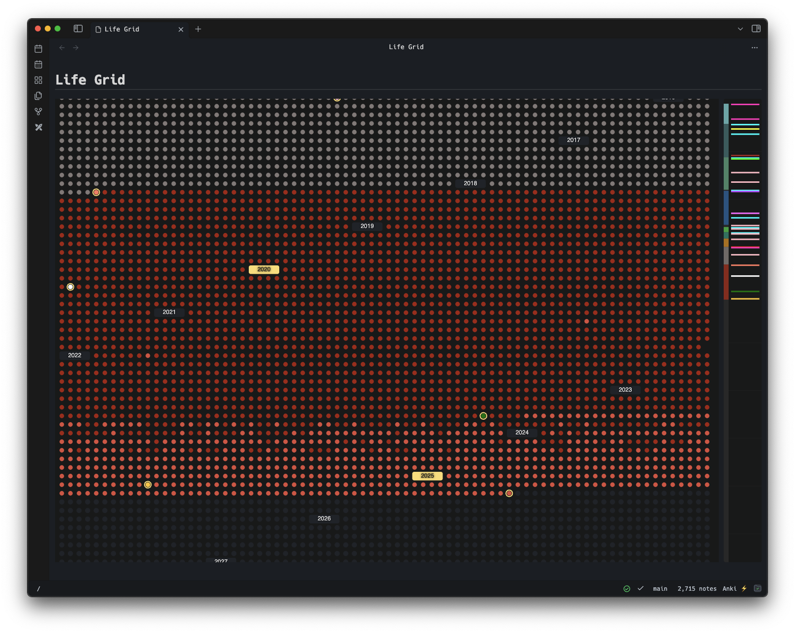 An Obsidian plugin to visualize your entire life as an interactive grid, where each dot represents a day of your existence (whether it's real or simulated).