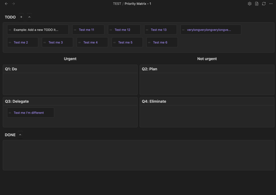 #TODOwill automatically appear in the matrix on refresh. Or simply press the refresh icon - Move Tasks: Drag tasks between quadrants to reprioritize them