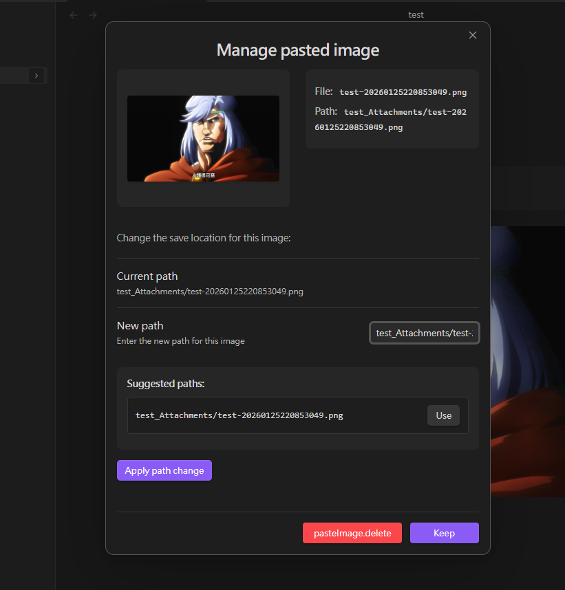 - Delete: delete the image file and remove its reference from the note/Canvas