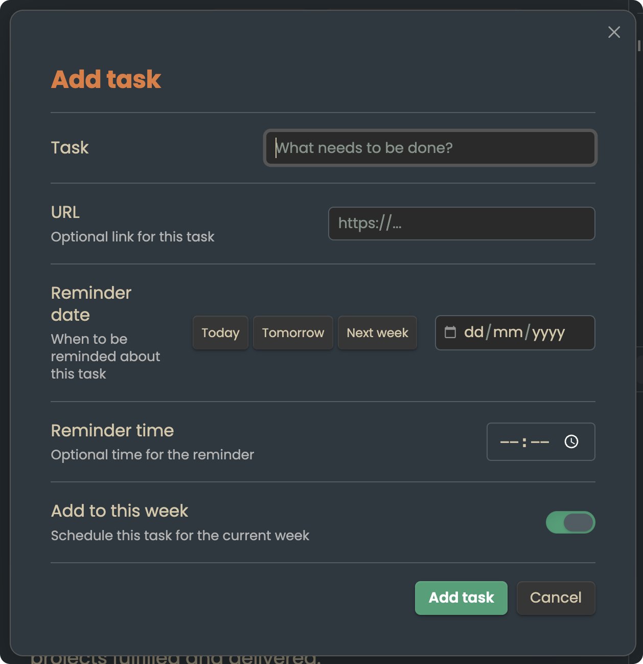 Quick AddAdd tasks on the fly without breaking your flow. New tasks go to your weekly list by default—they won't clutter your immediate focus unless you explicitly promote them. |