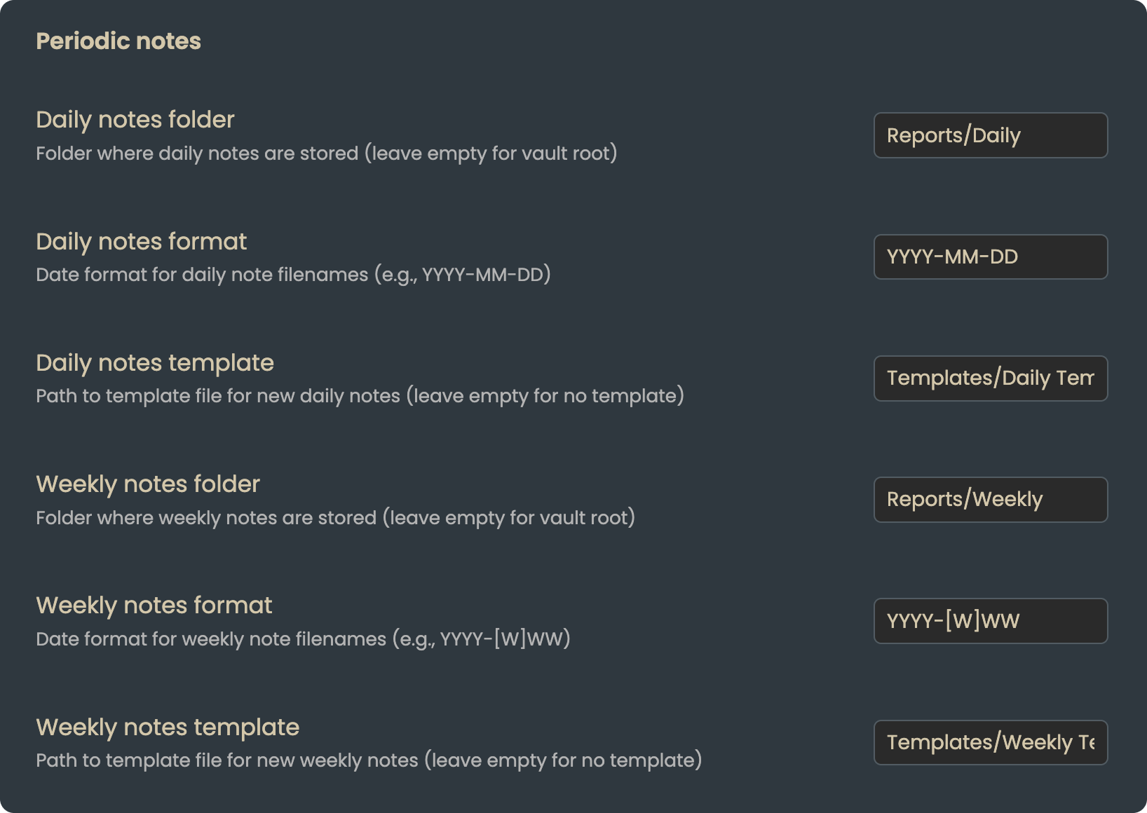 | Periodic notes | Daily/weekly note integration | Configurable |
