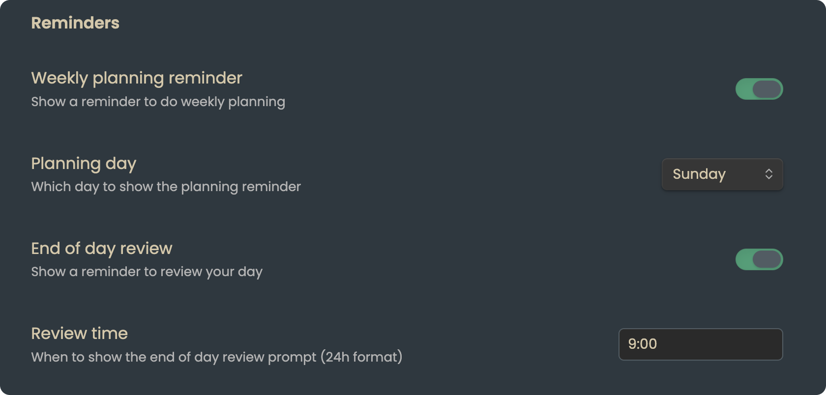 | Weekly planning reminder | Prompt to plan on a specific day | Enabled (Sunday) |